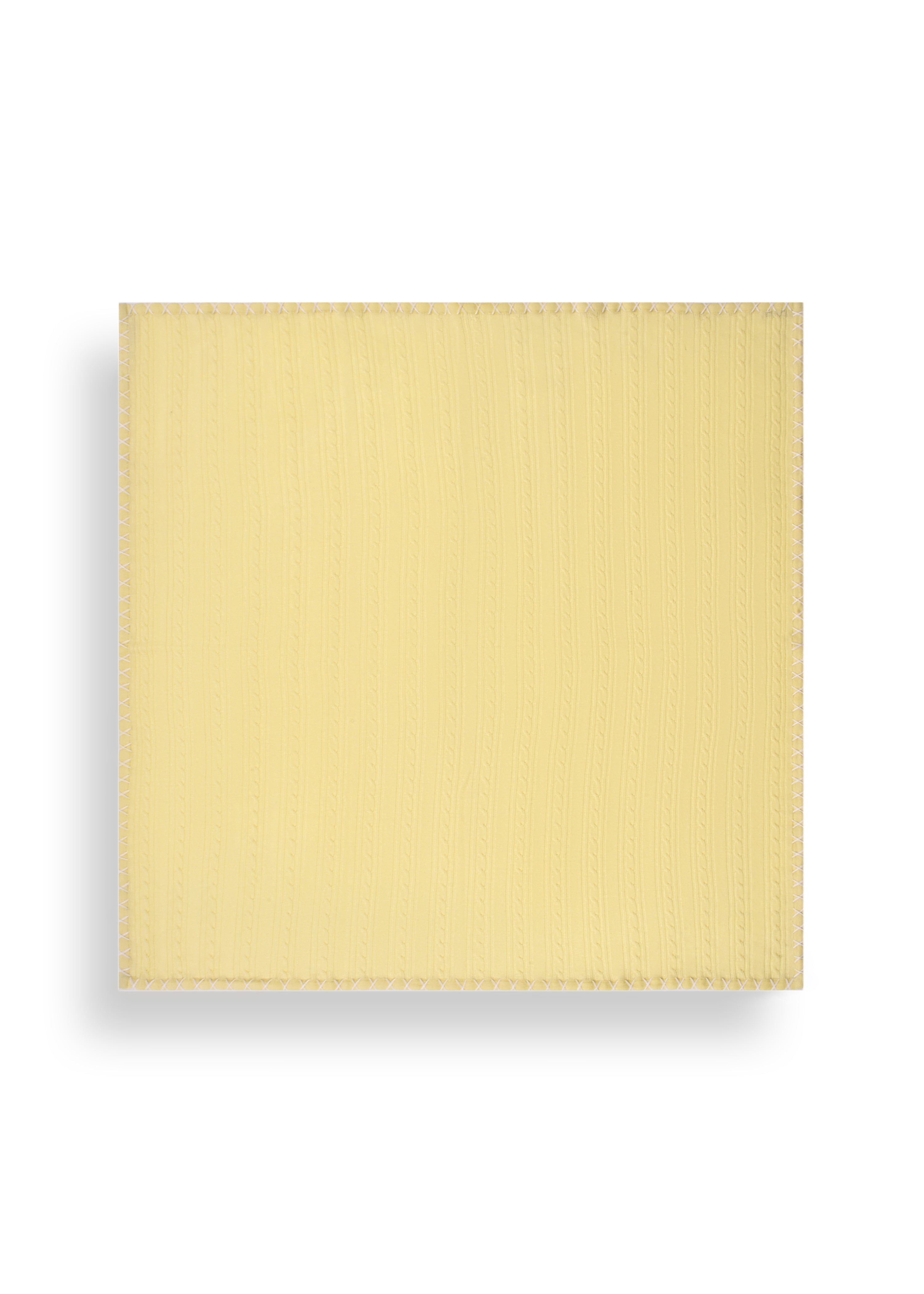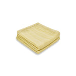 Soft and lightweight cable knit baby blanket in pure Merino, on a lemon base, with ivory cross stitch edging.