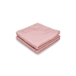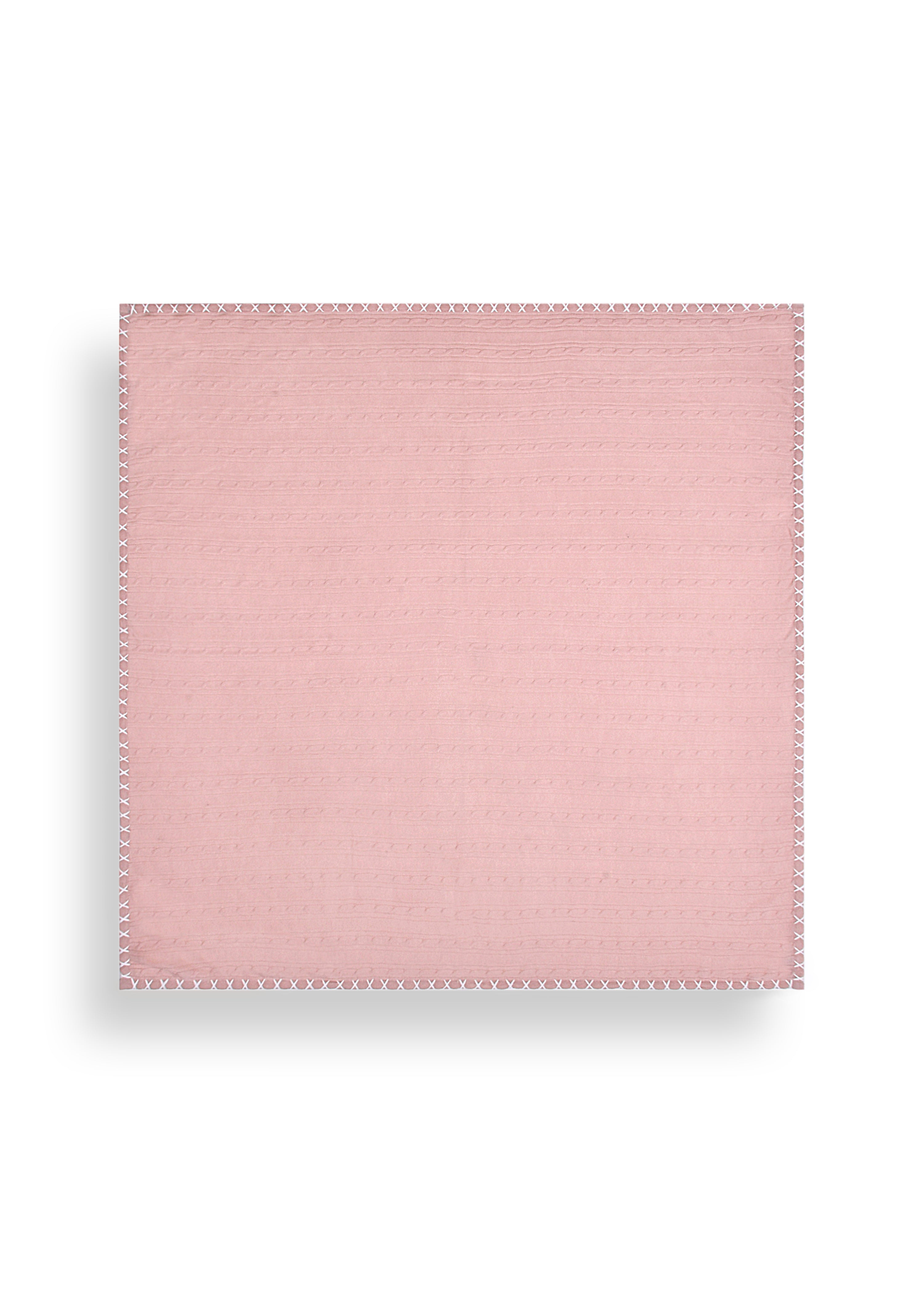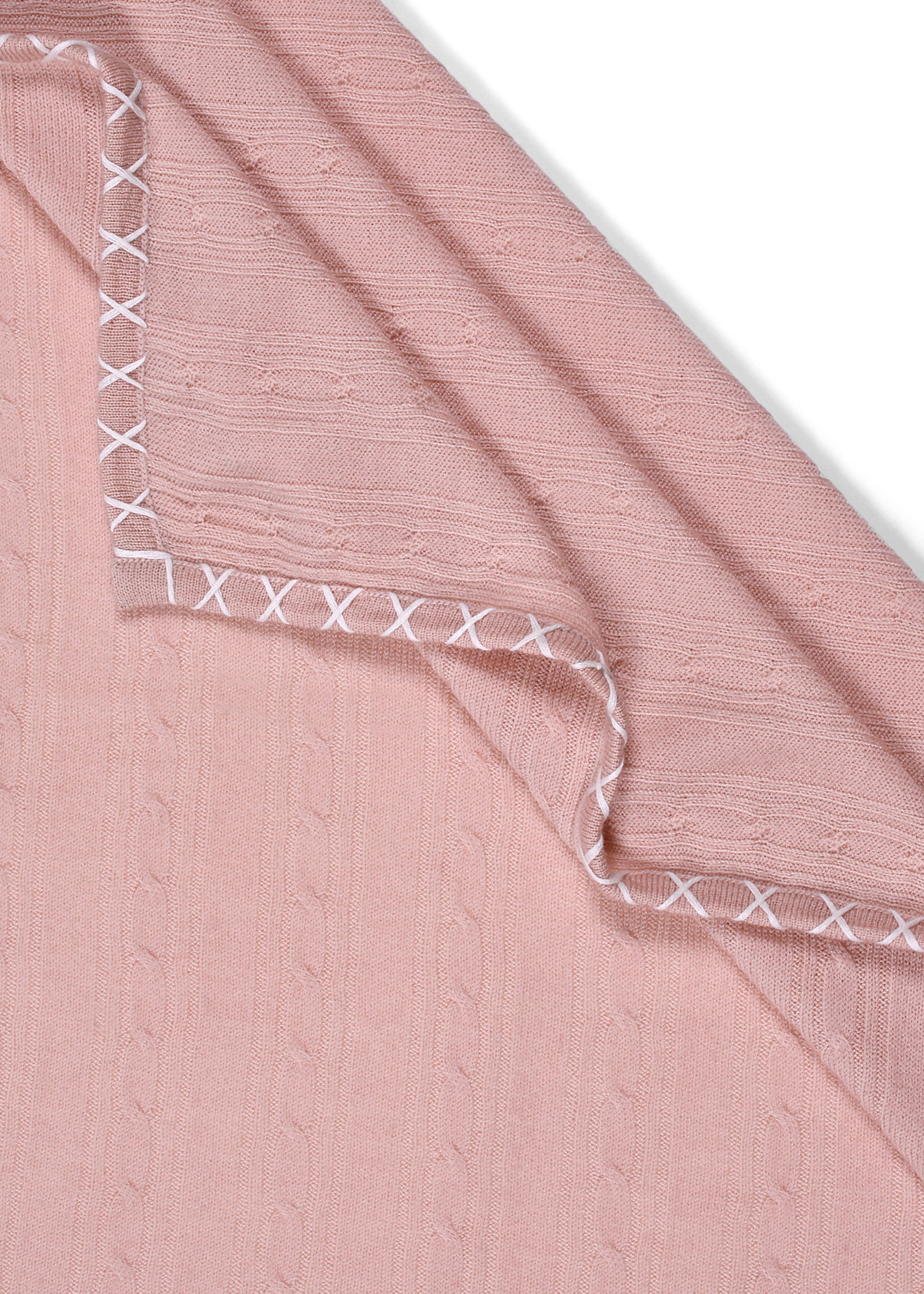 Soft and lightweight cable knit baby blanket in pure Cashmere, on a nude base, with ivory cross stitch edging.