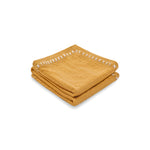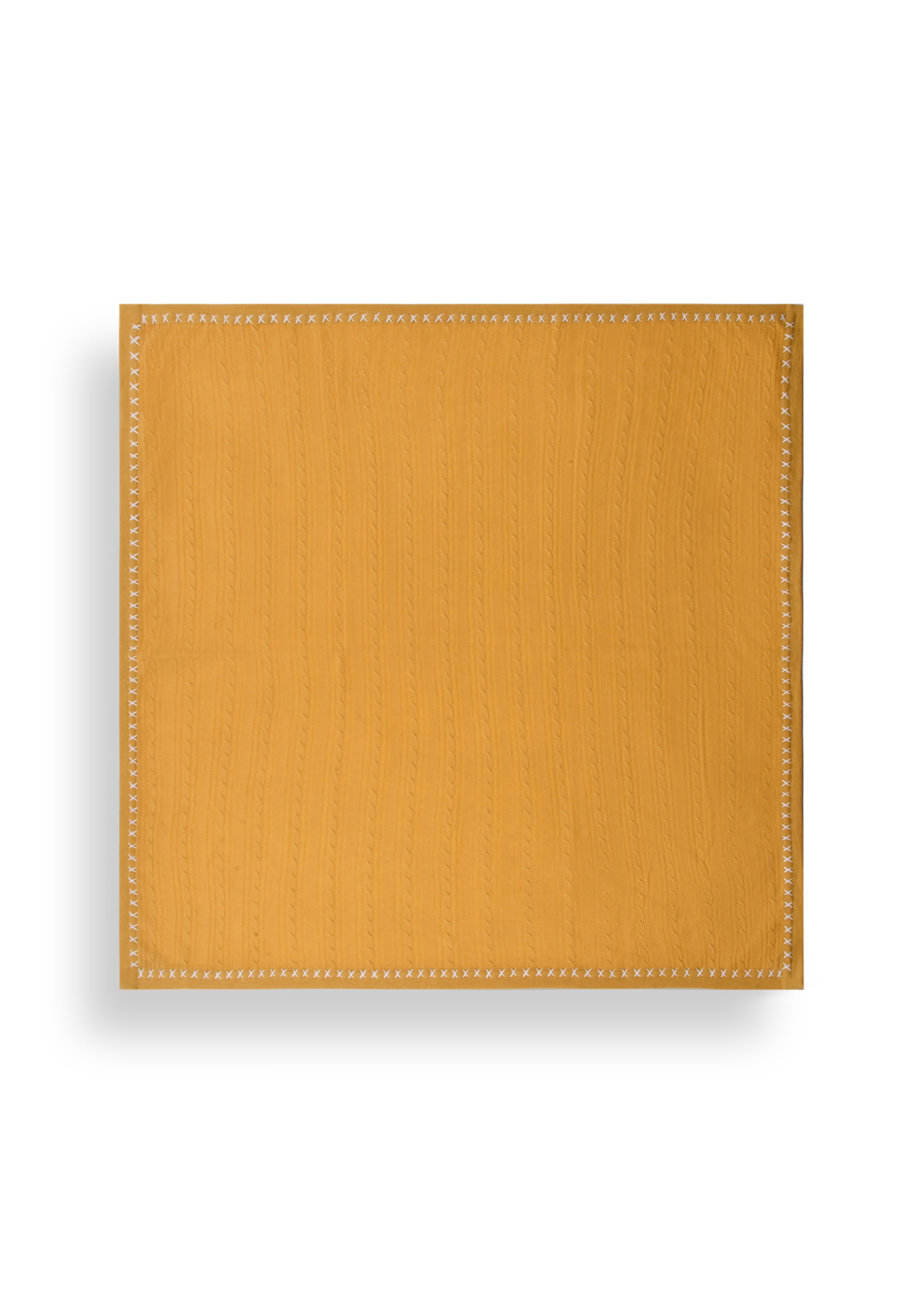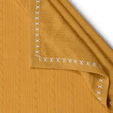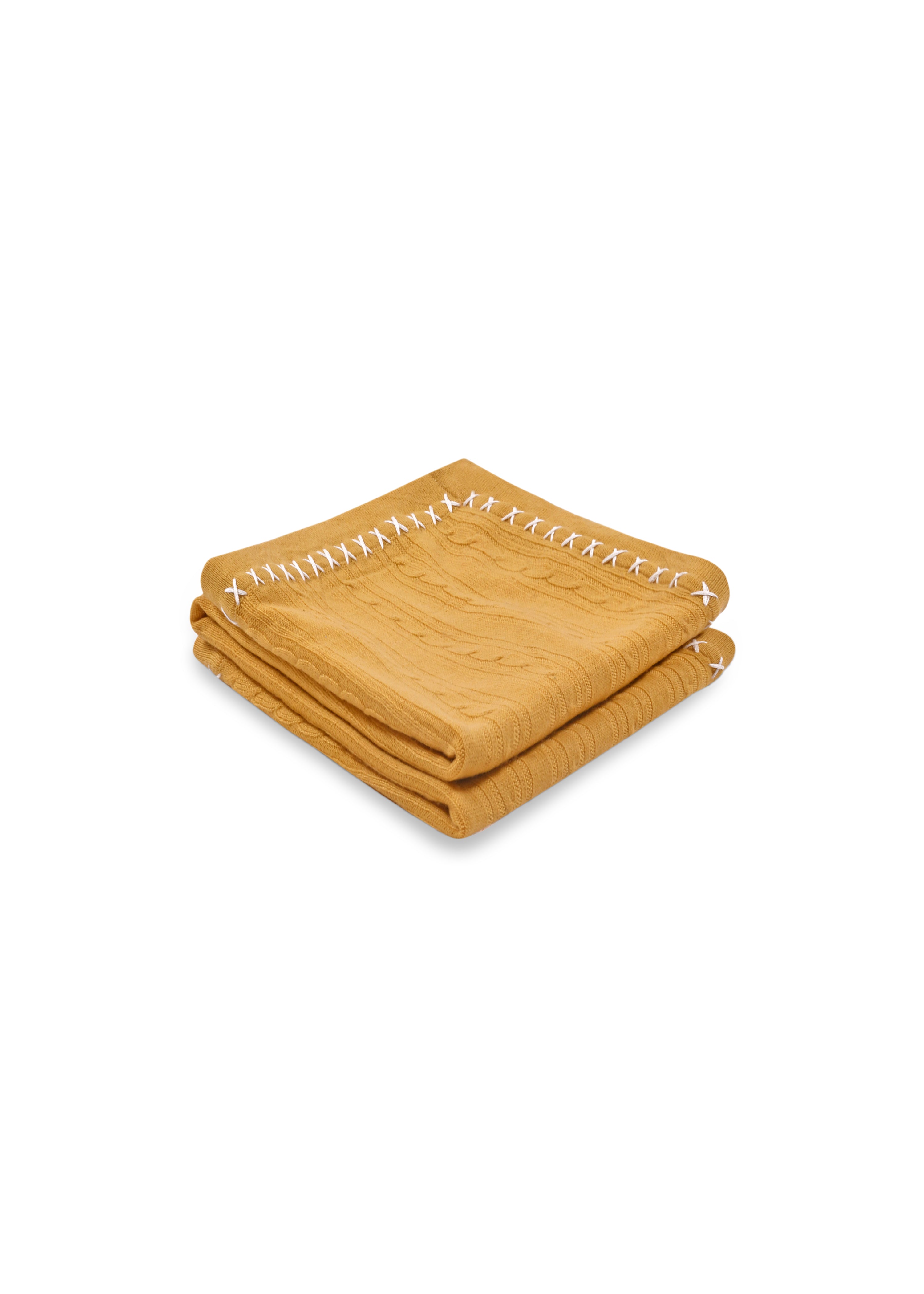 Soft and lightweight cable knit baby blanket in pure Cashmere, on a ochre base, with ivory cross stitch edging.