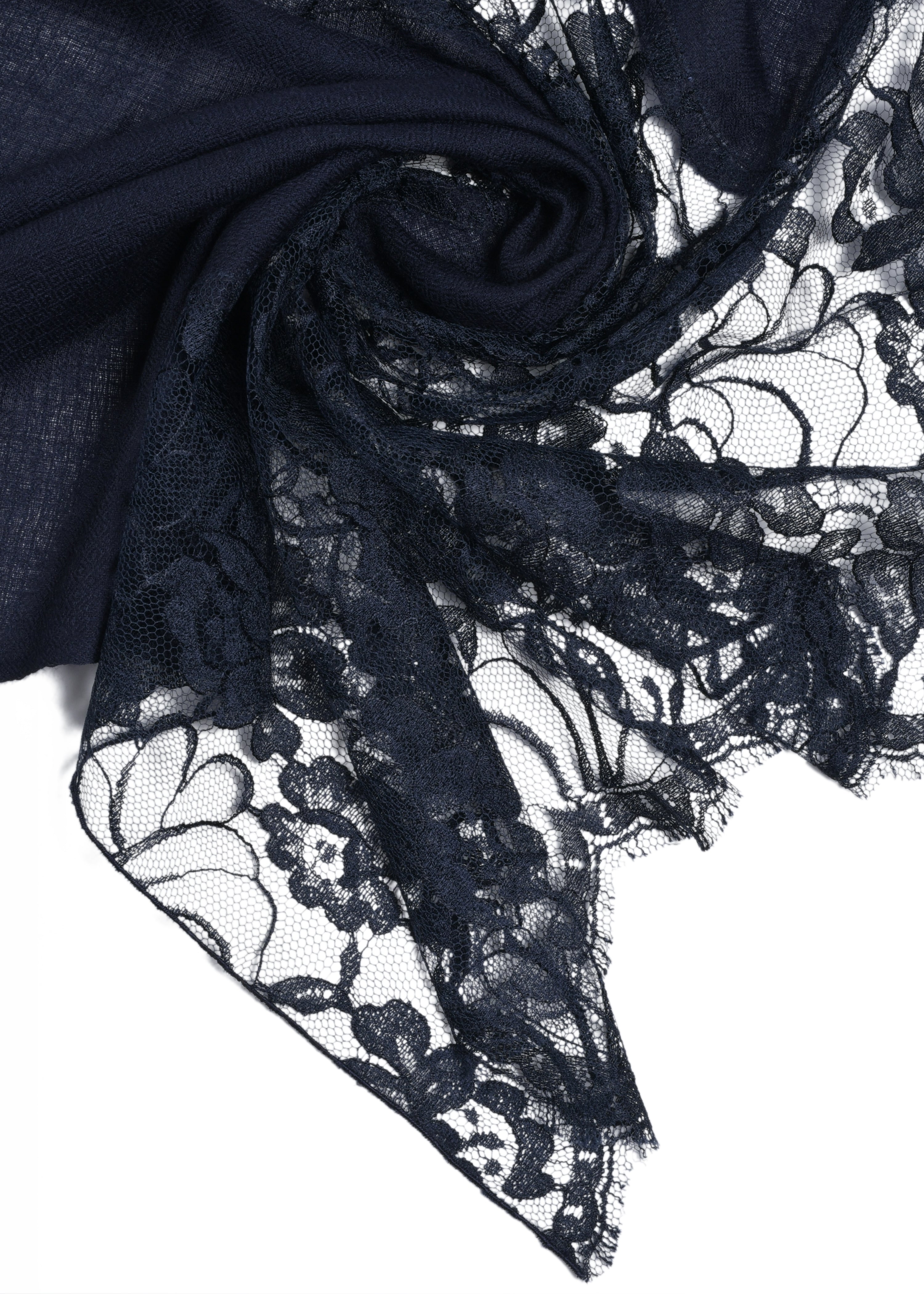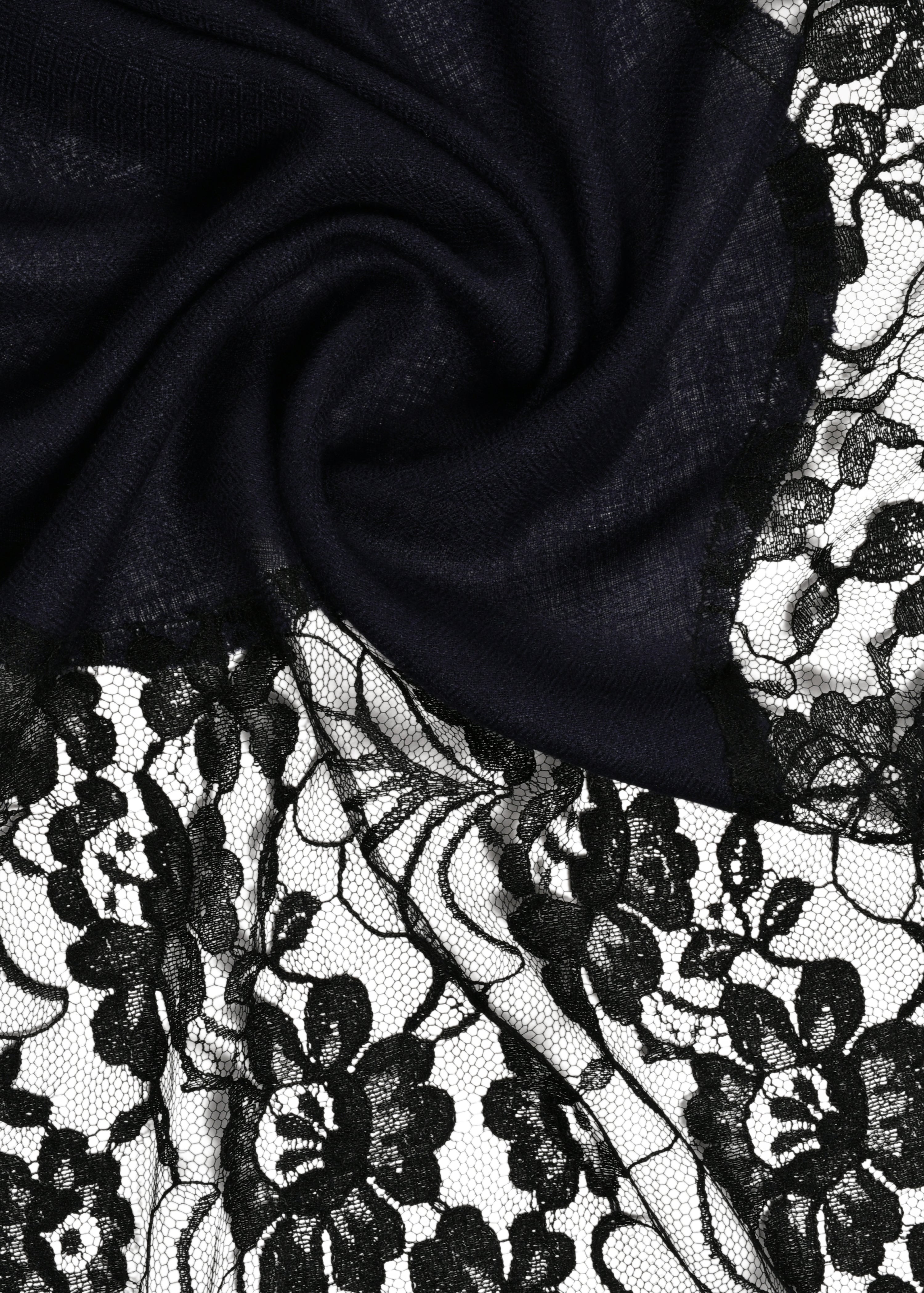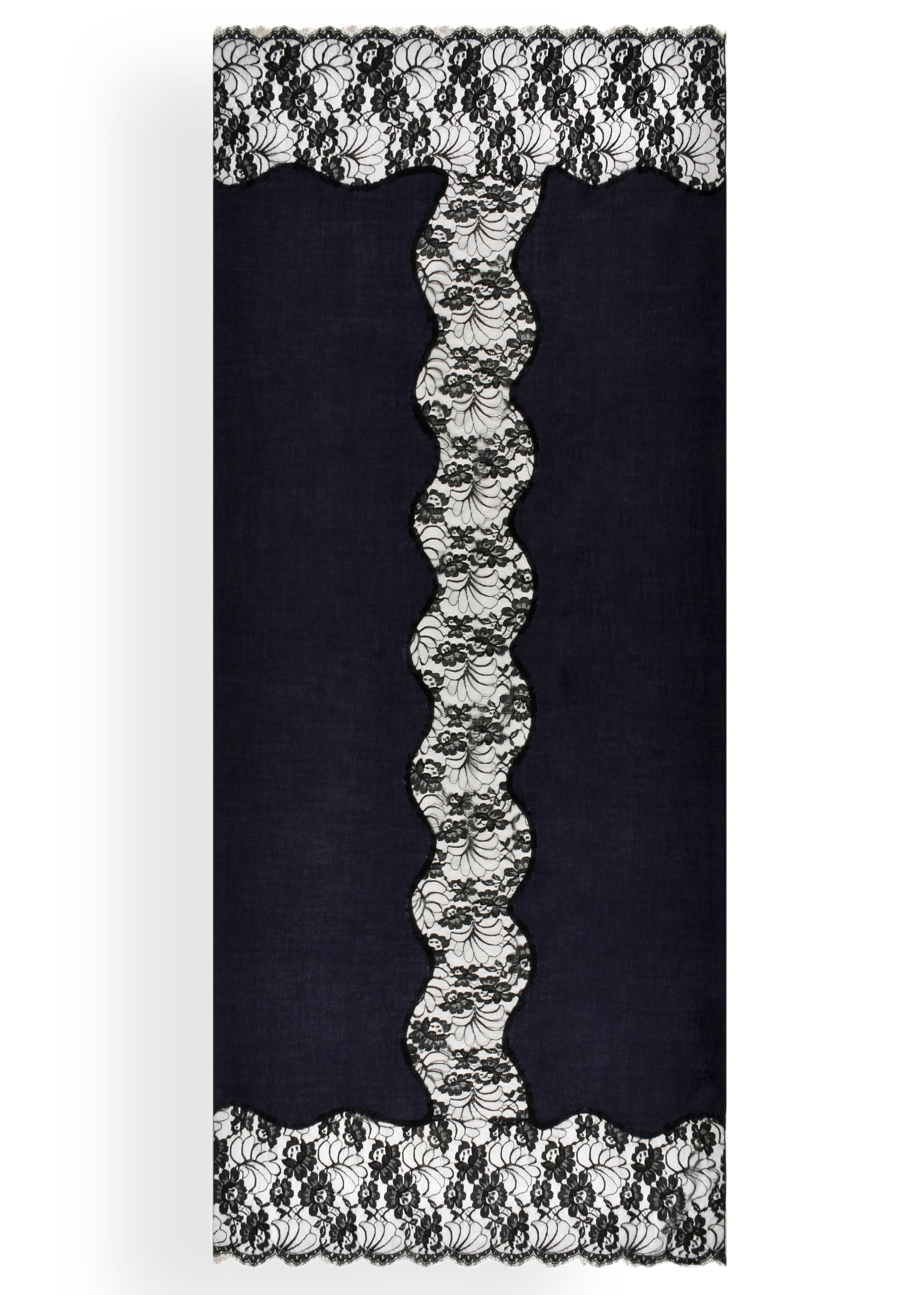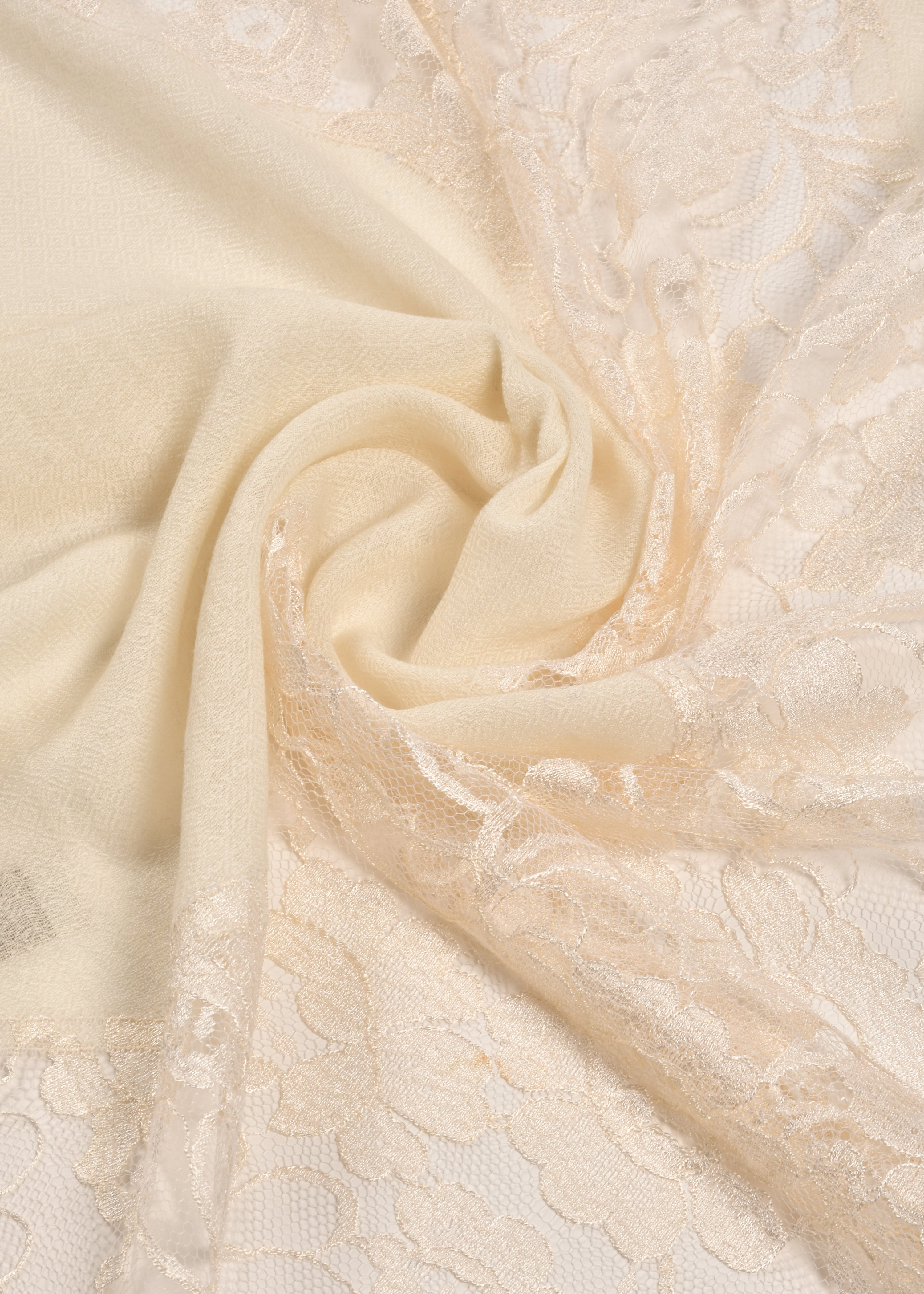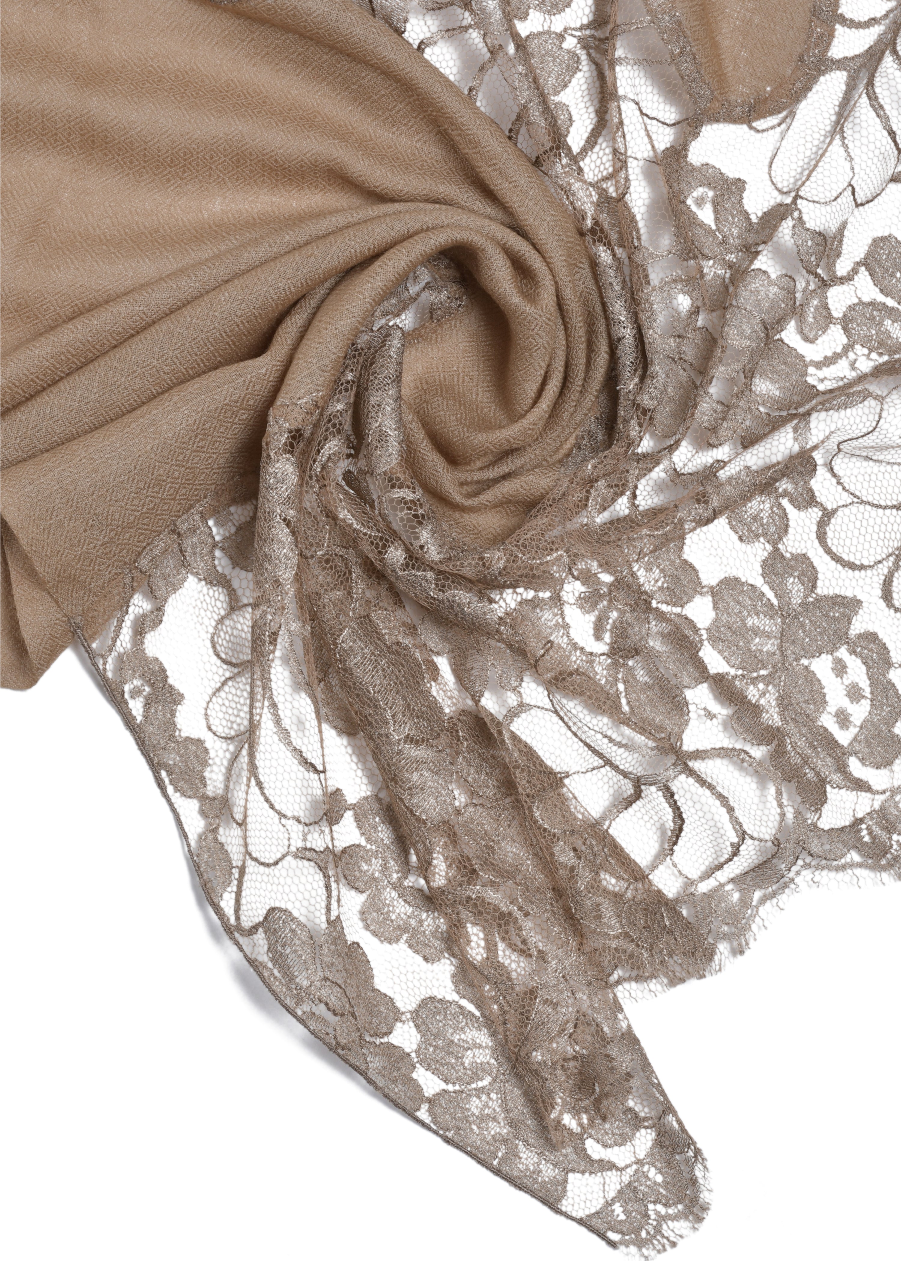 A Janavi Original, a fine Chantilly lace cloud emerges as if from a genies lamp, making a mystic path across finely spun cashmere.