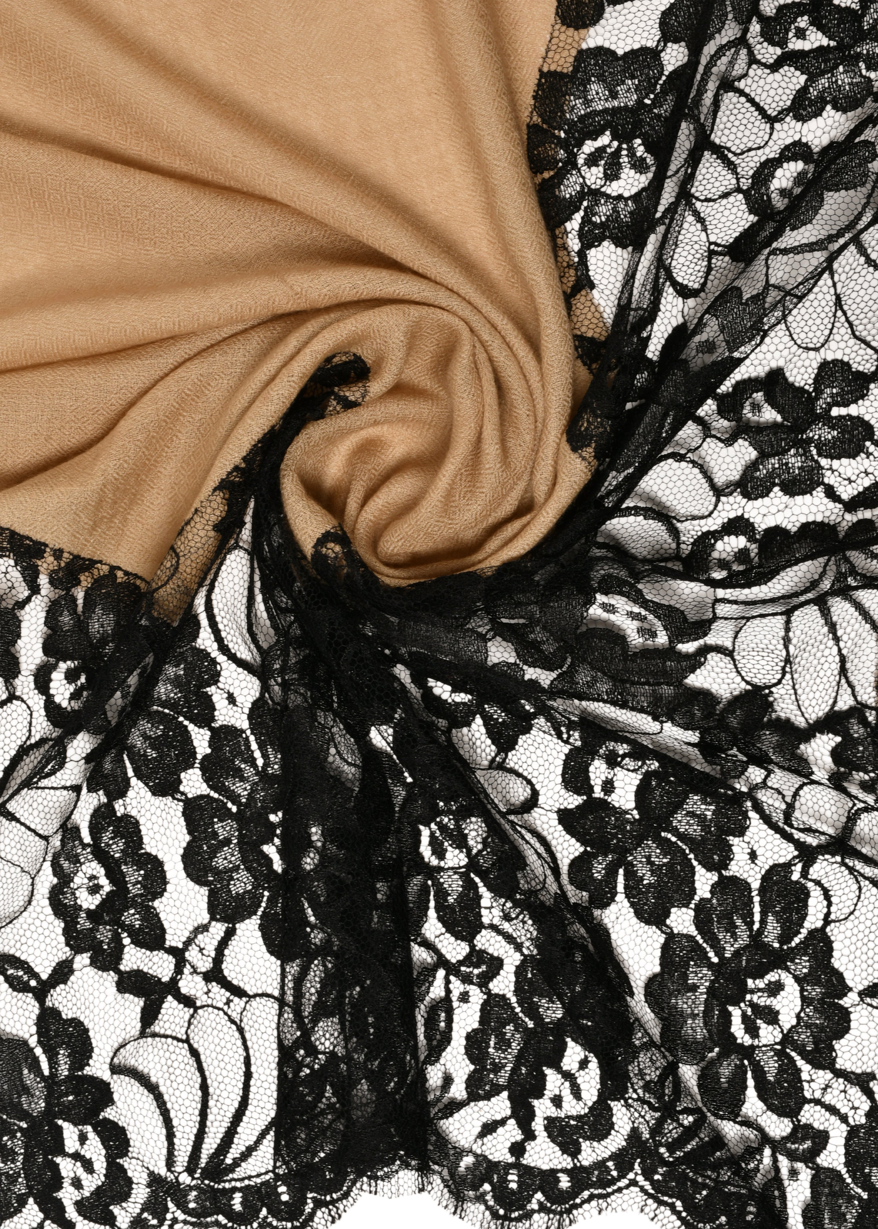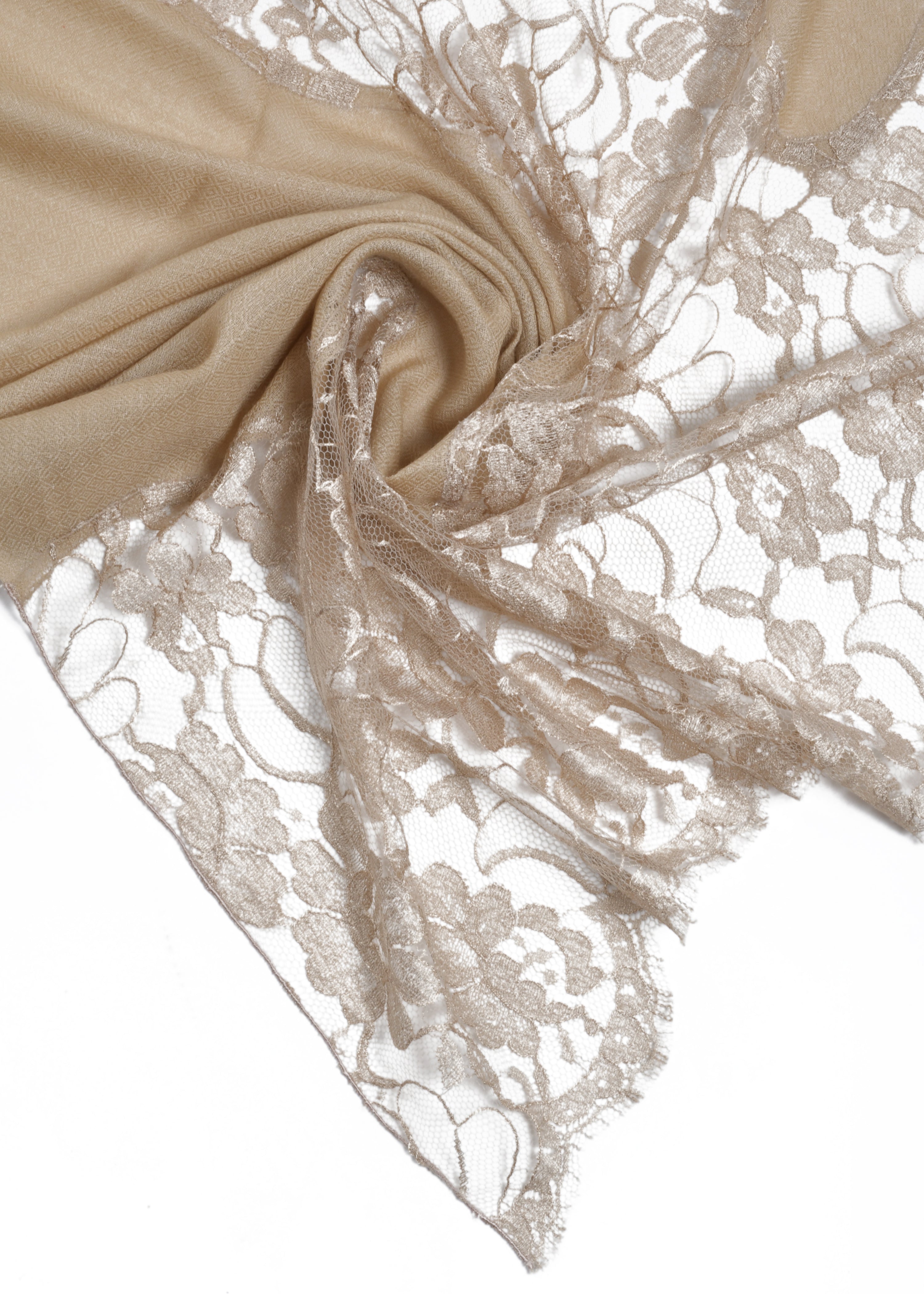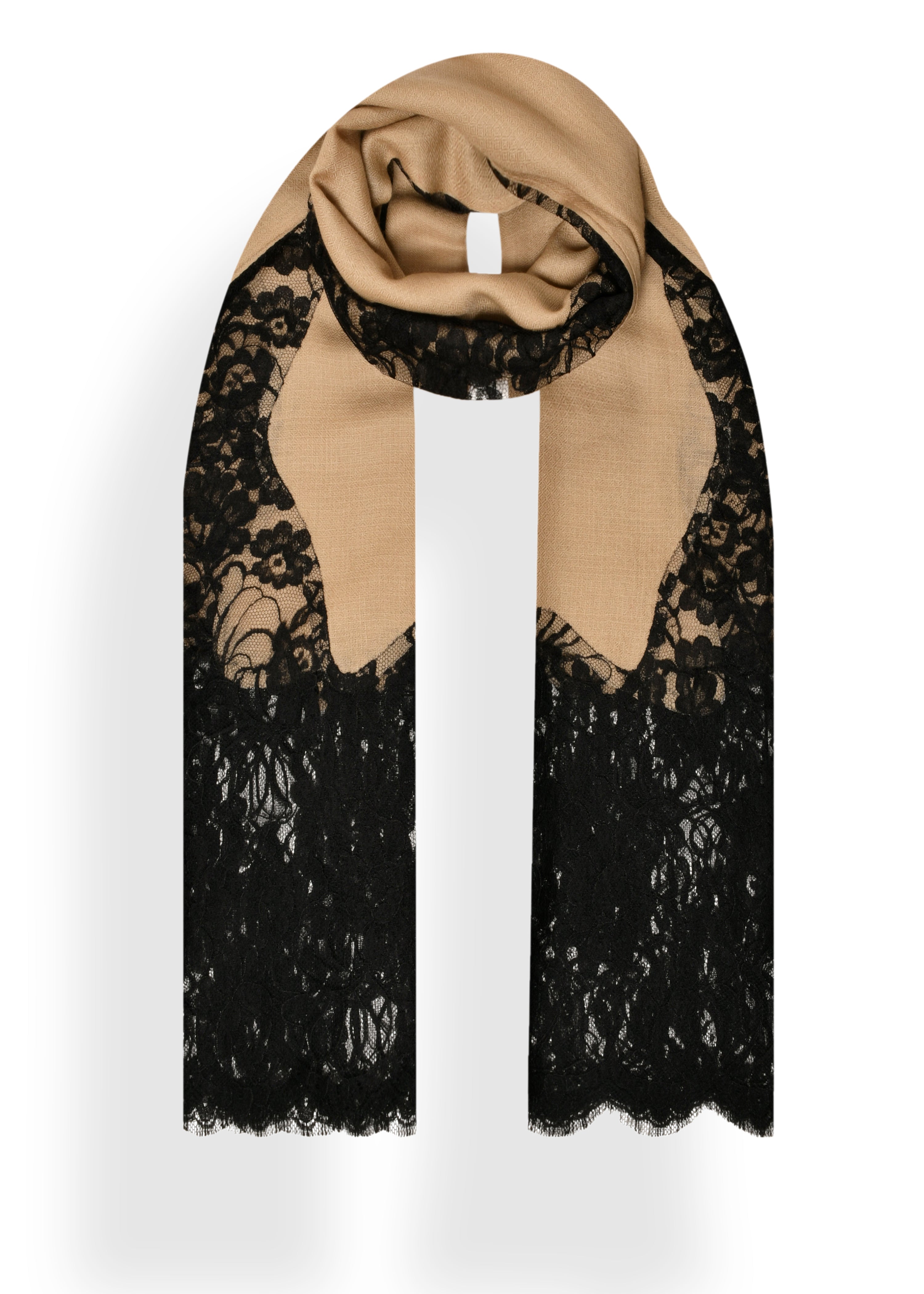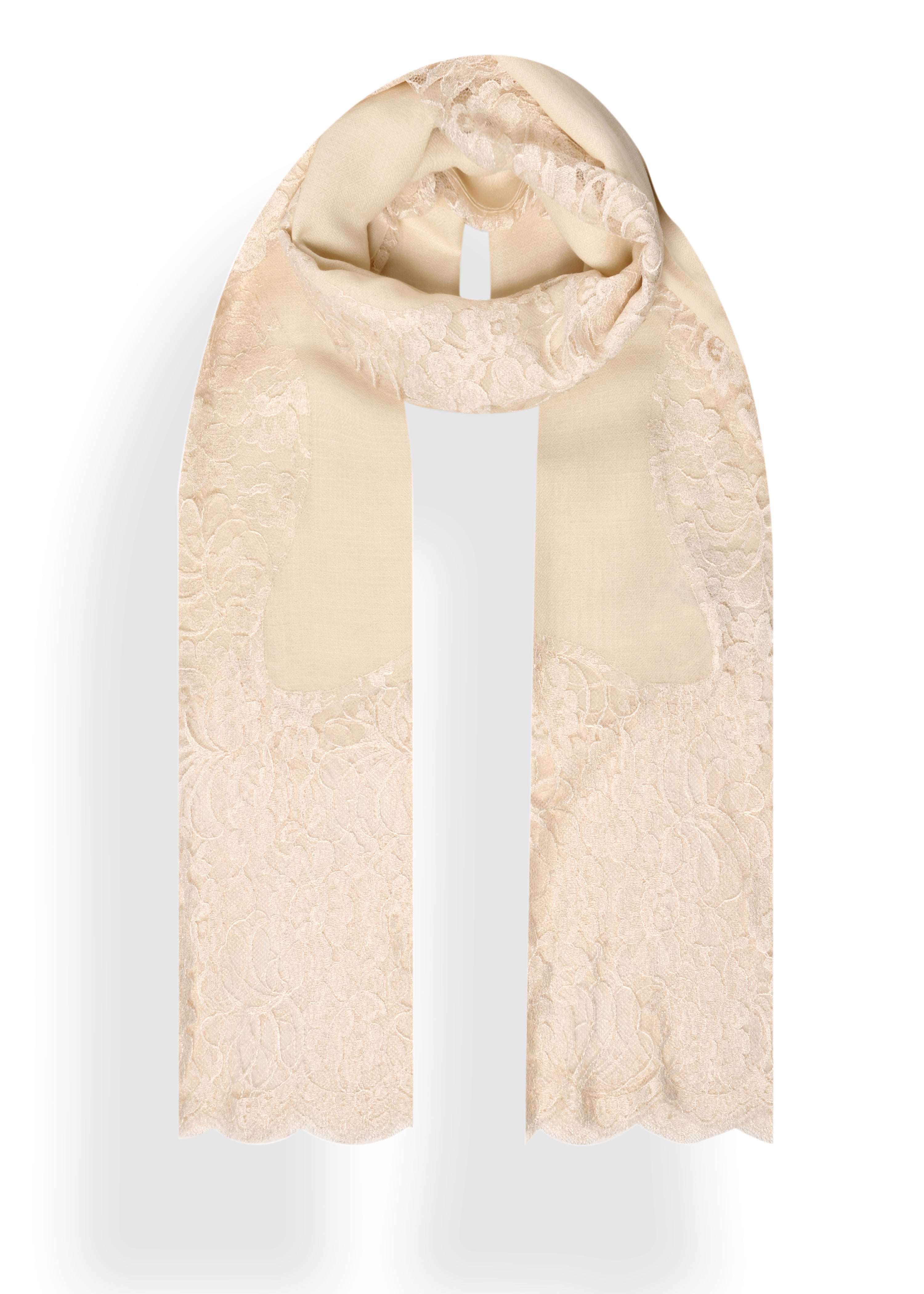 A Janavi Original, a fine Chantilly lace cloud emerges as if from a genies lamp, making a mystic path across finely spun cashmere.