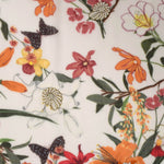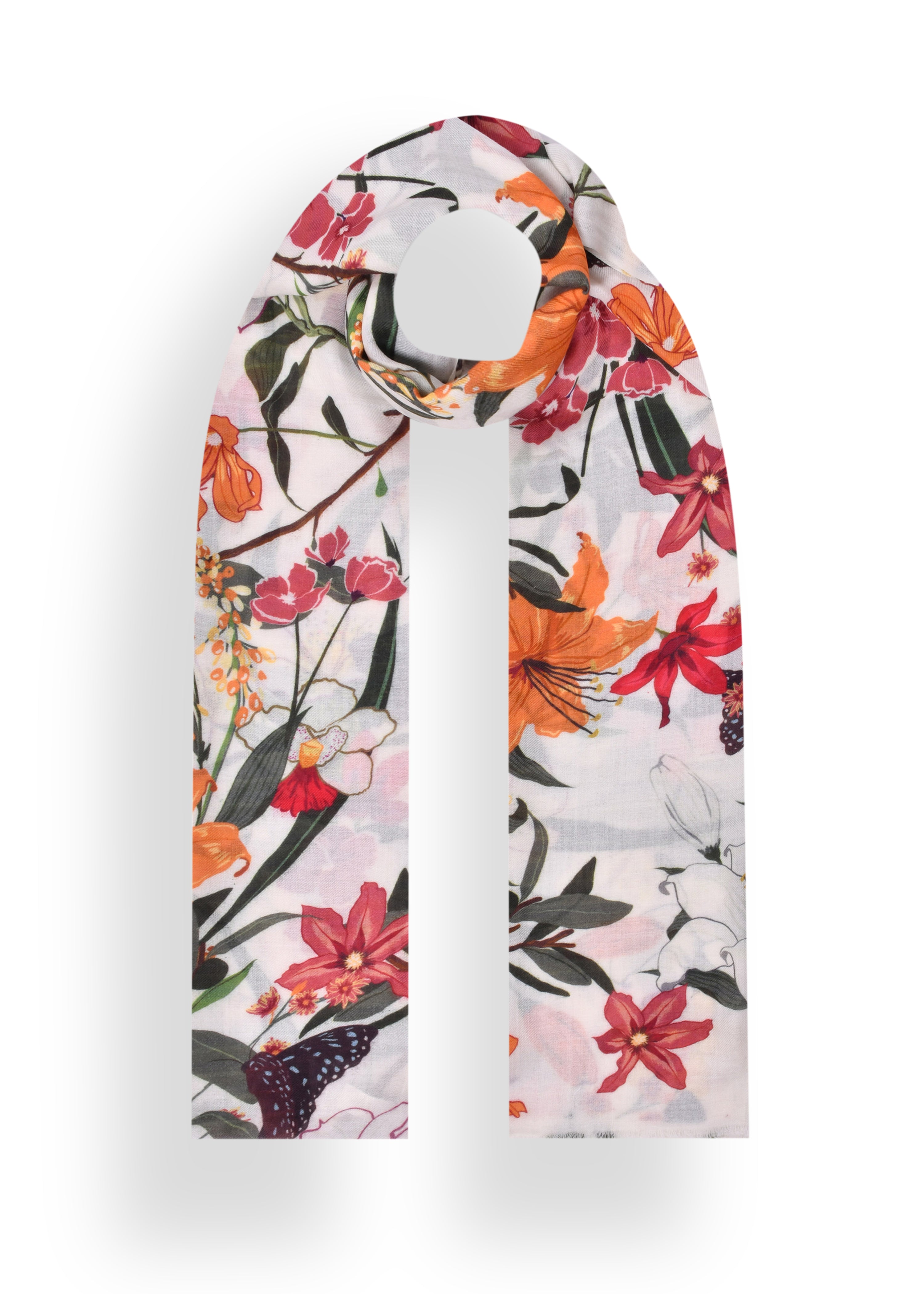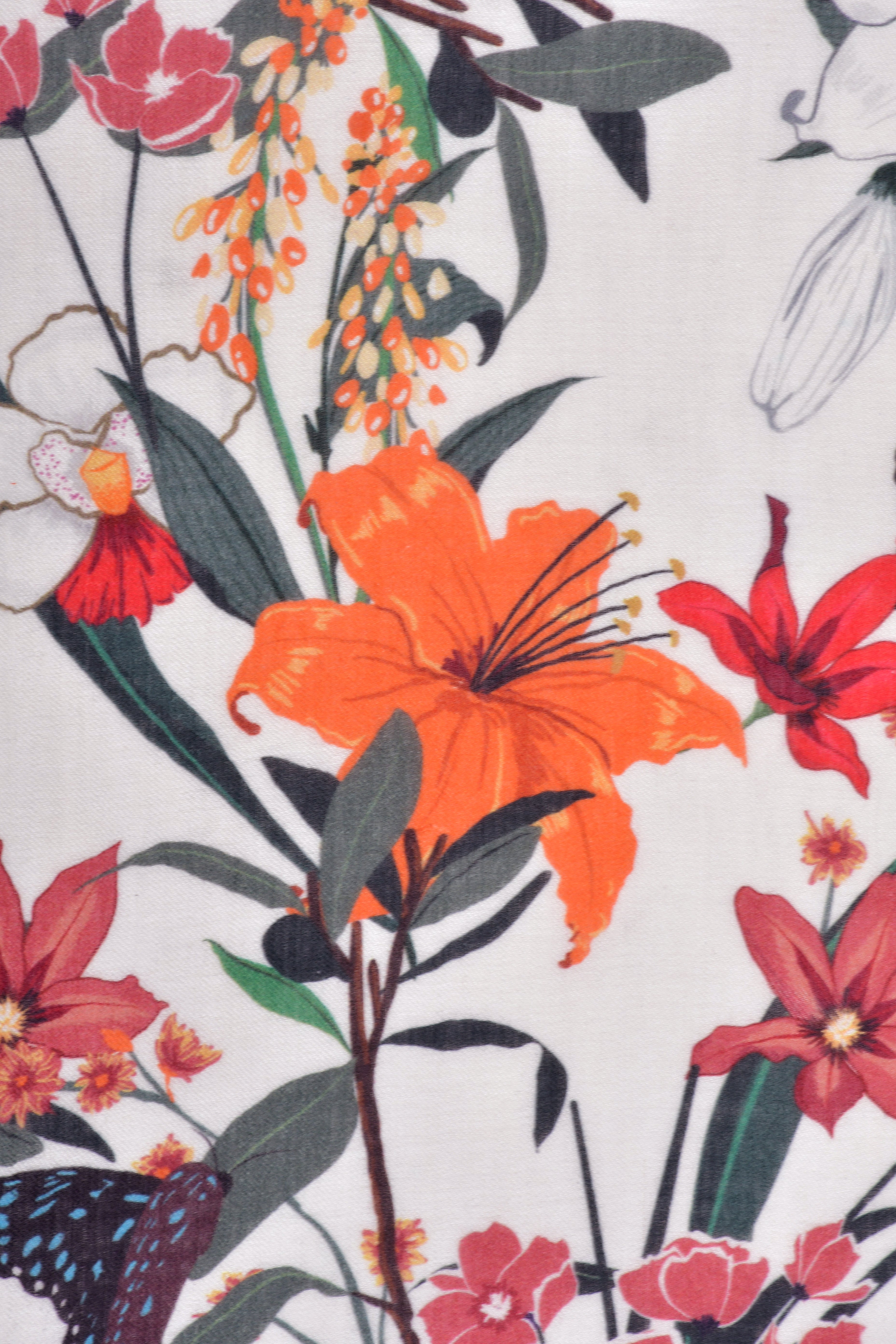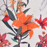 bursts with coral and floral motifs, pairing perfectly with lush green blooms