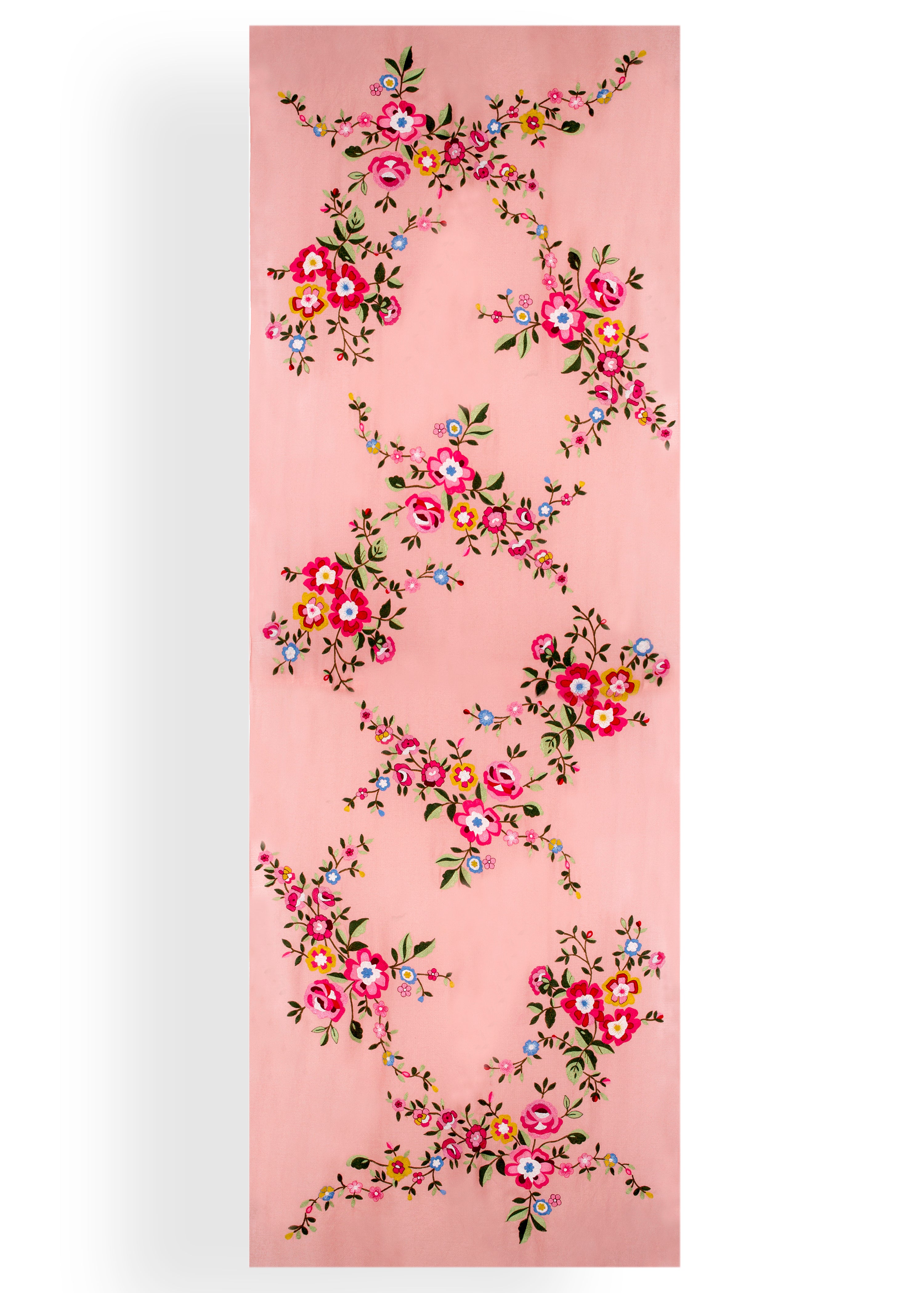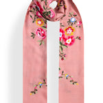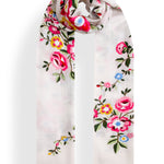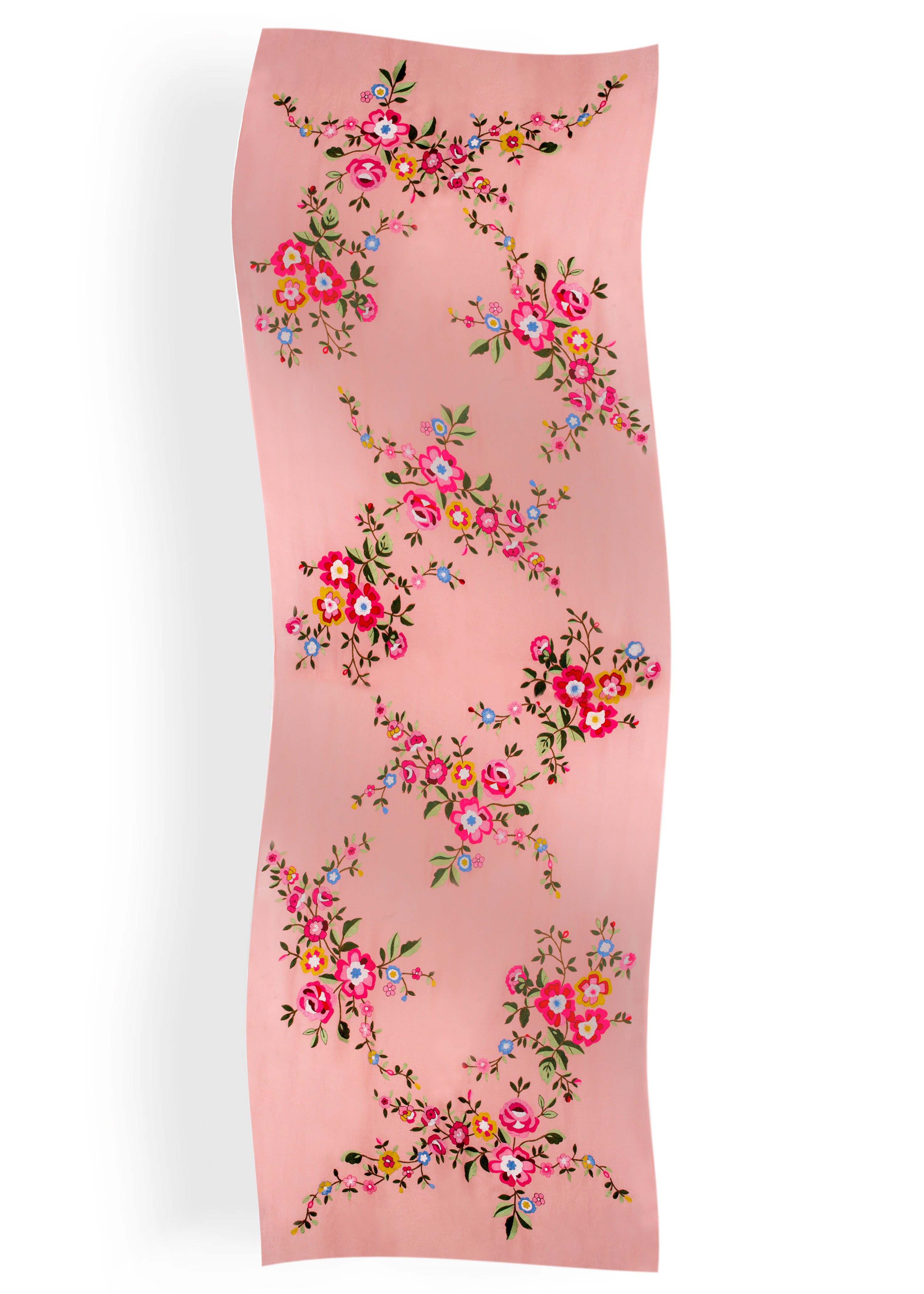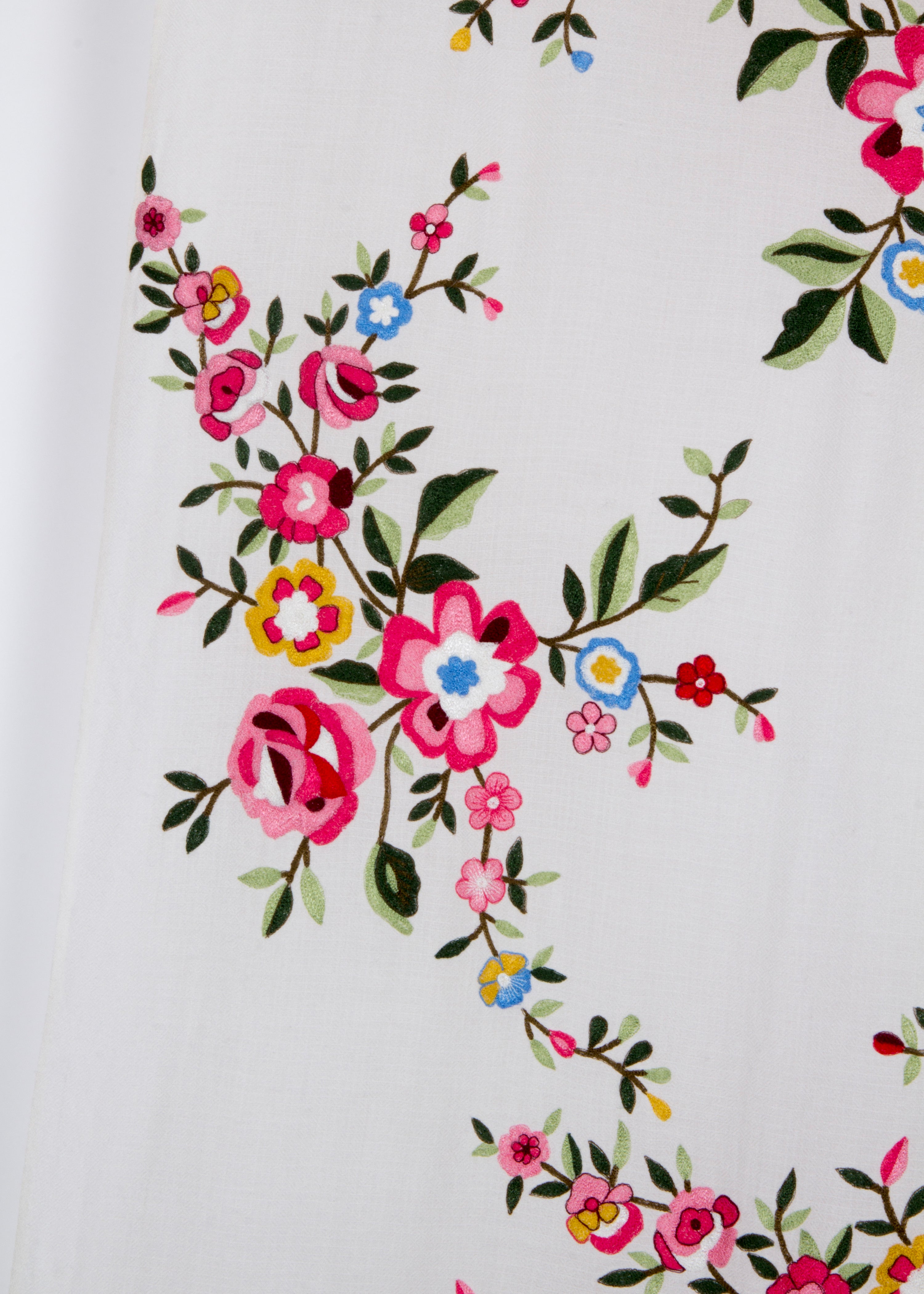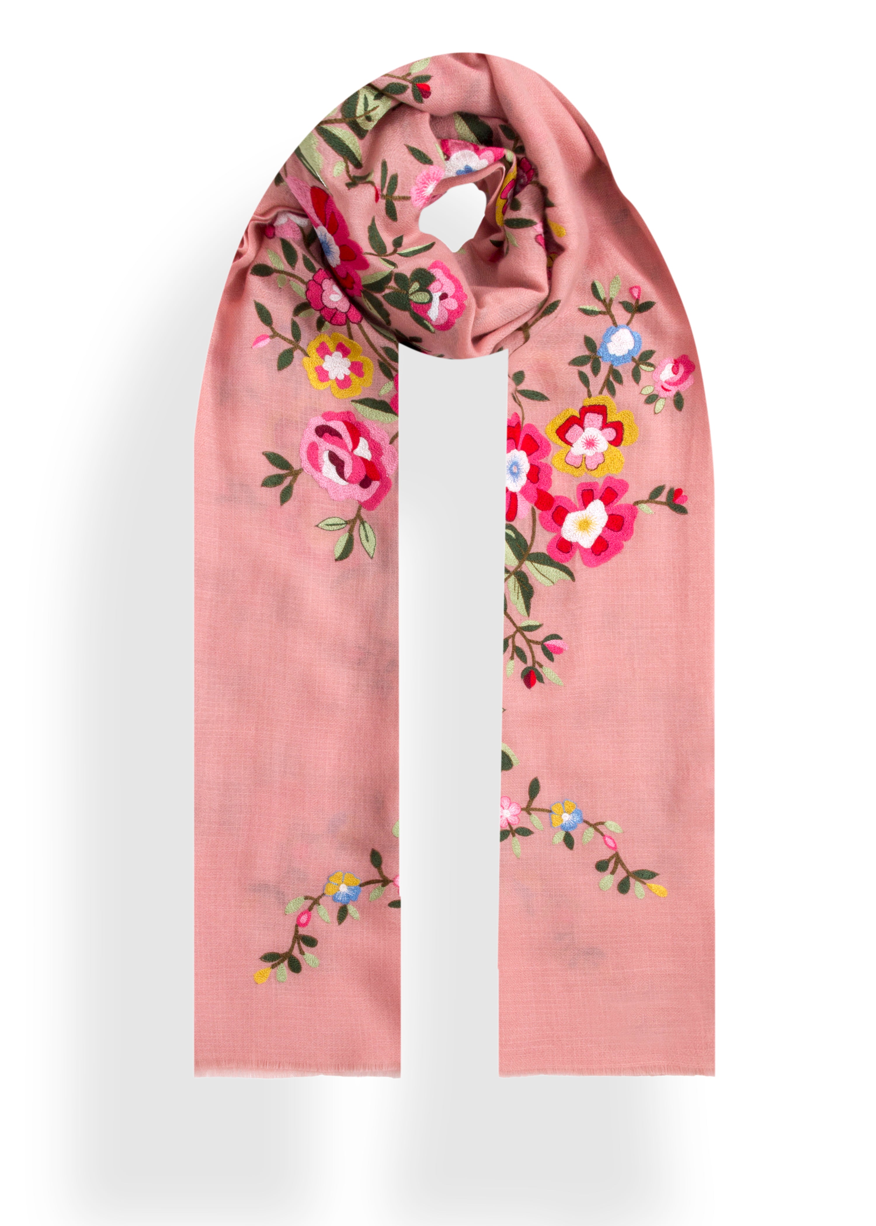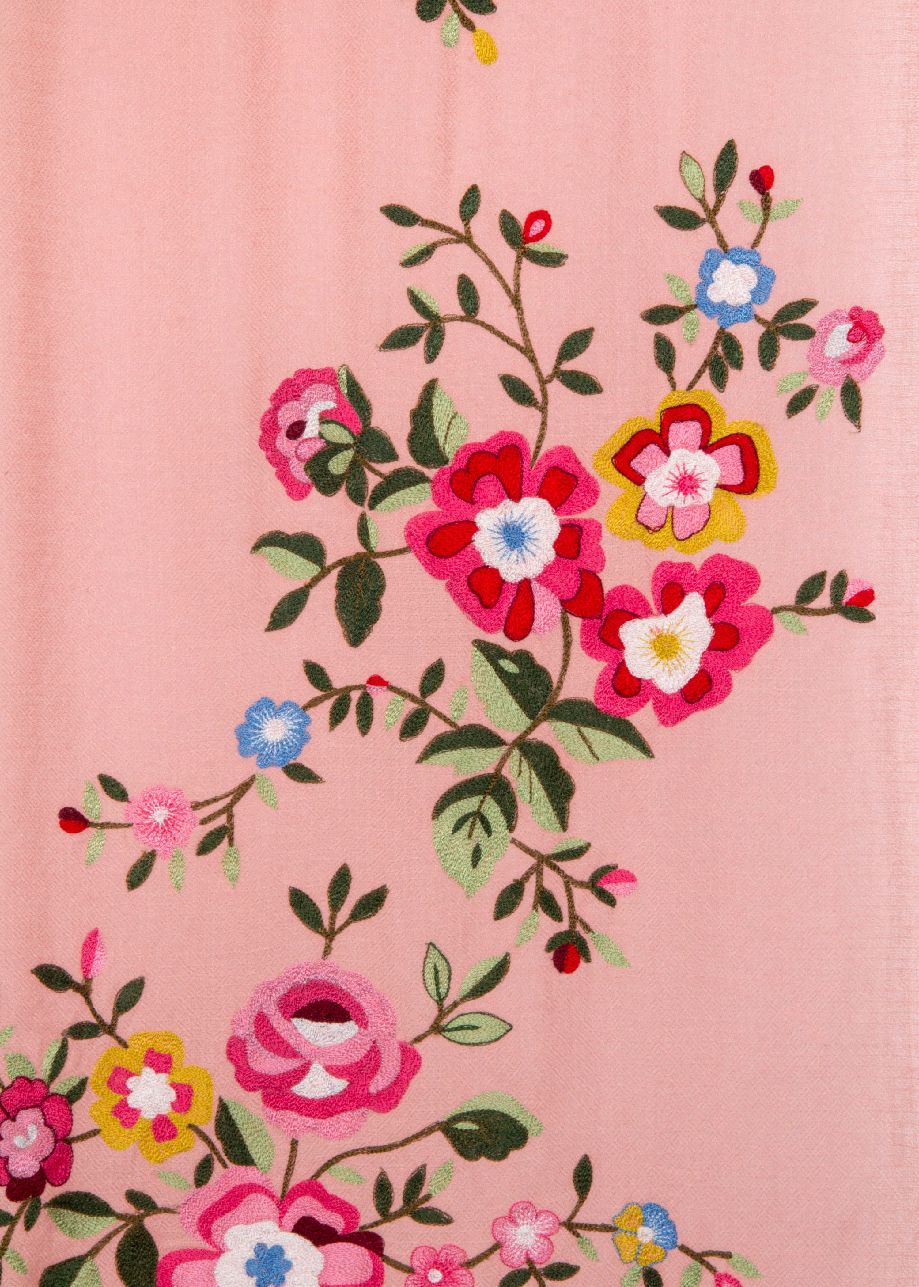 Finely spun soft cashmere with a veil of blooming spring garden to wrap yourself within. Every fold in this piece has a silk thread floral surprise hidden within.