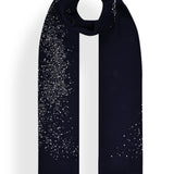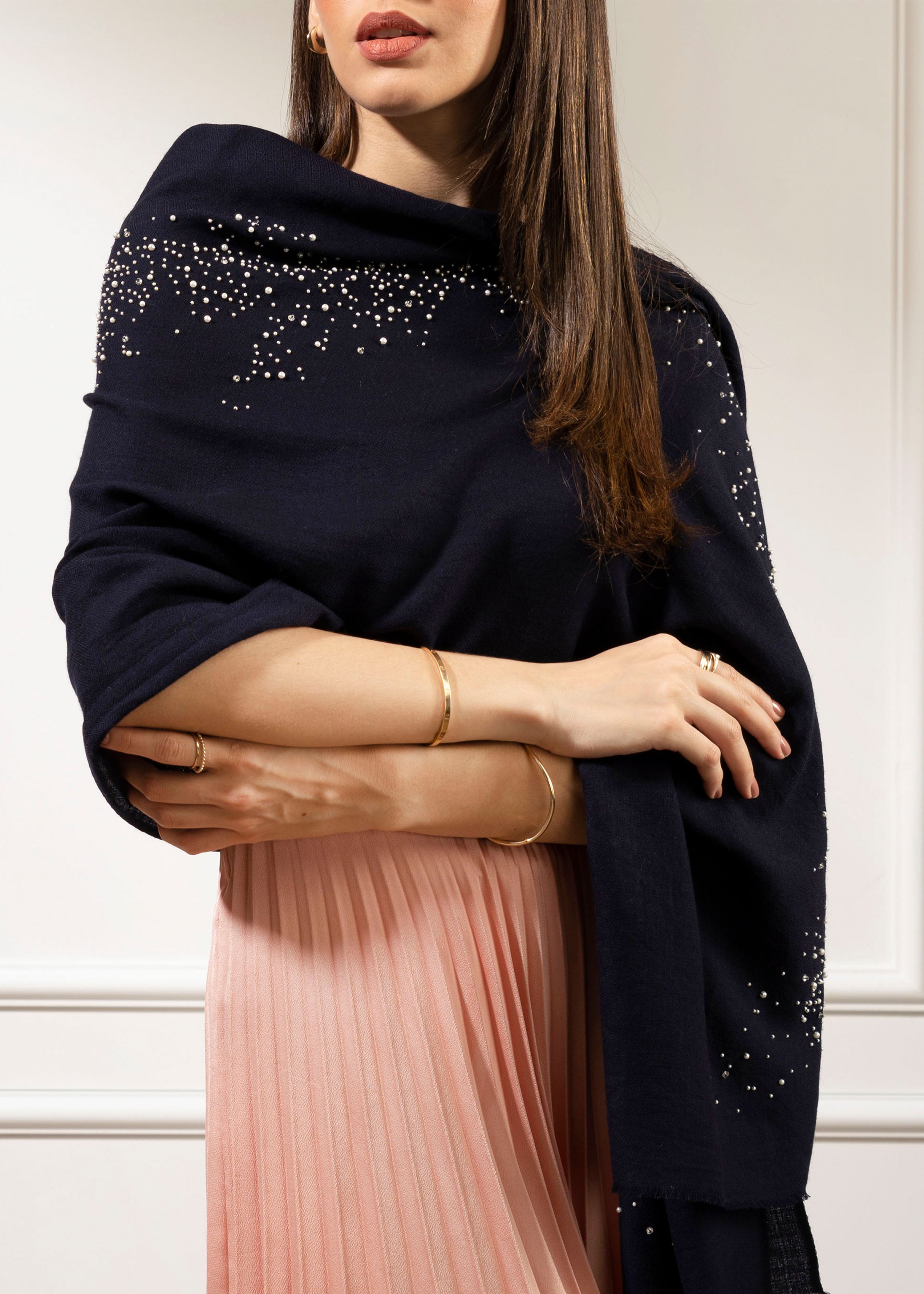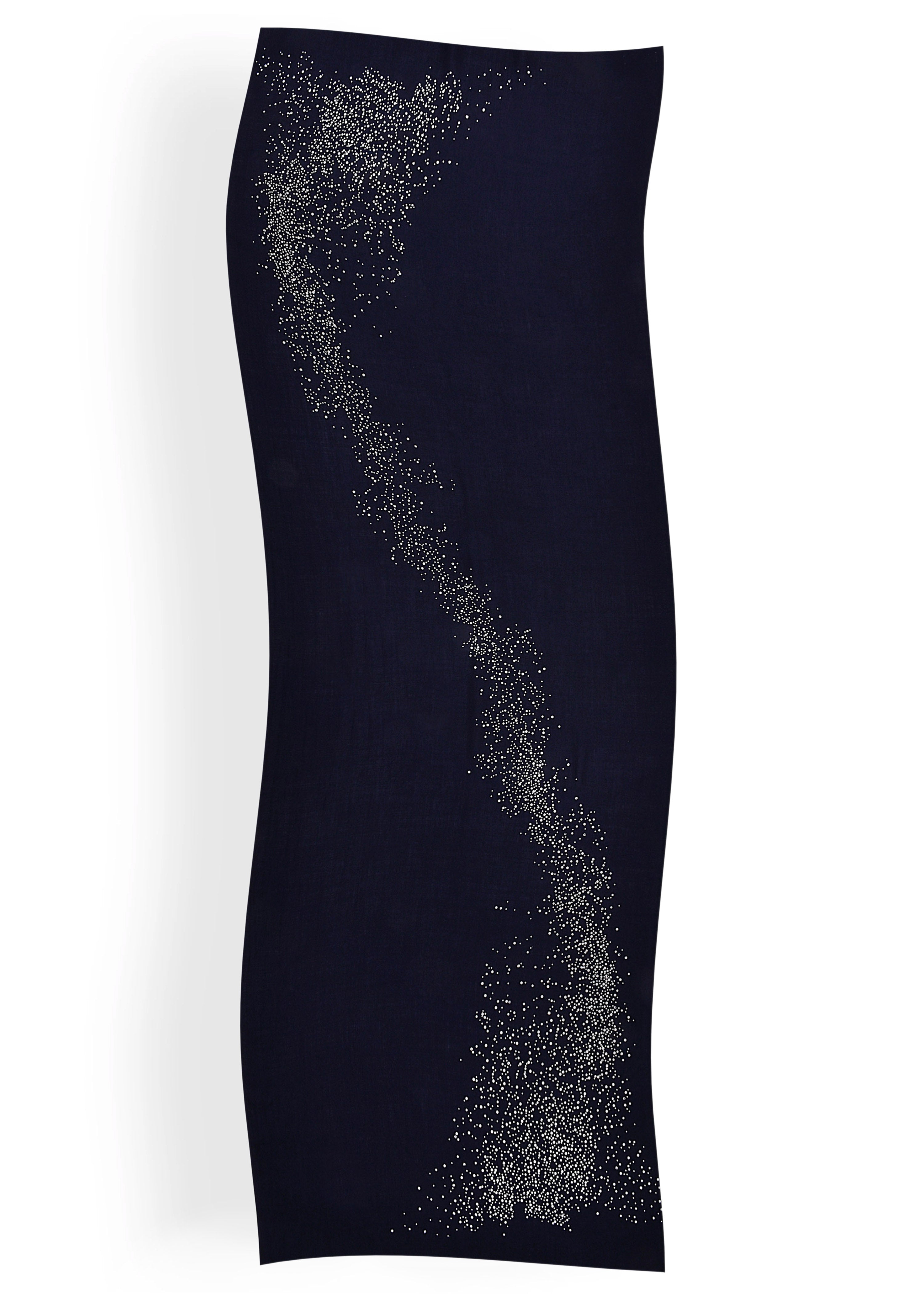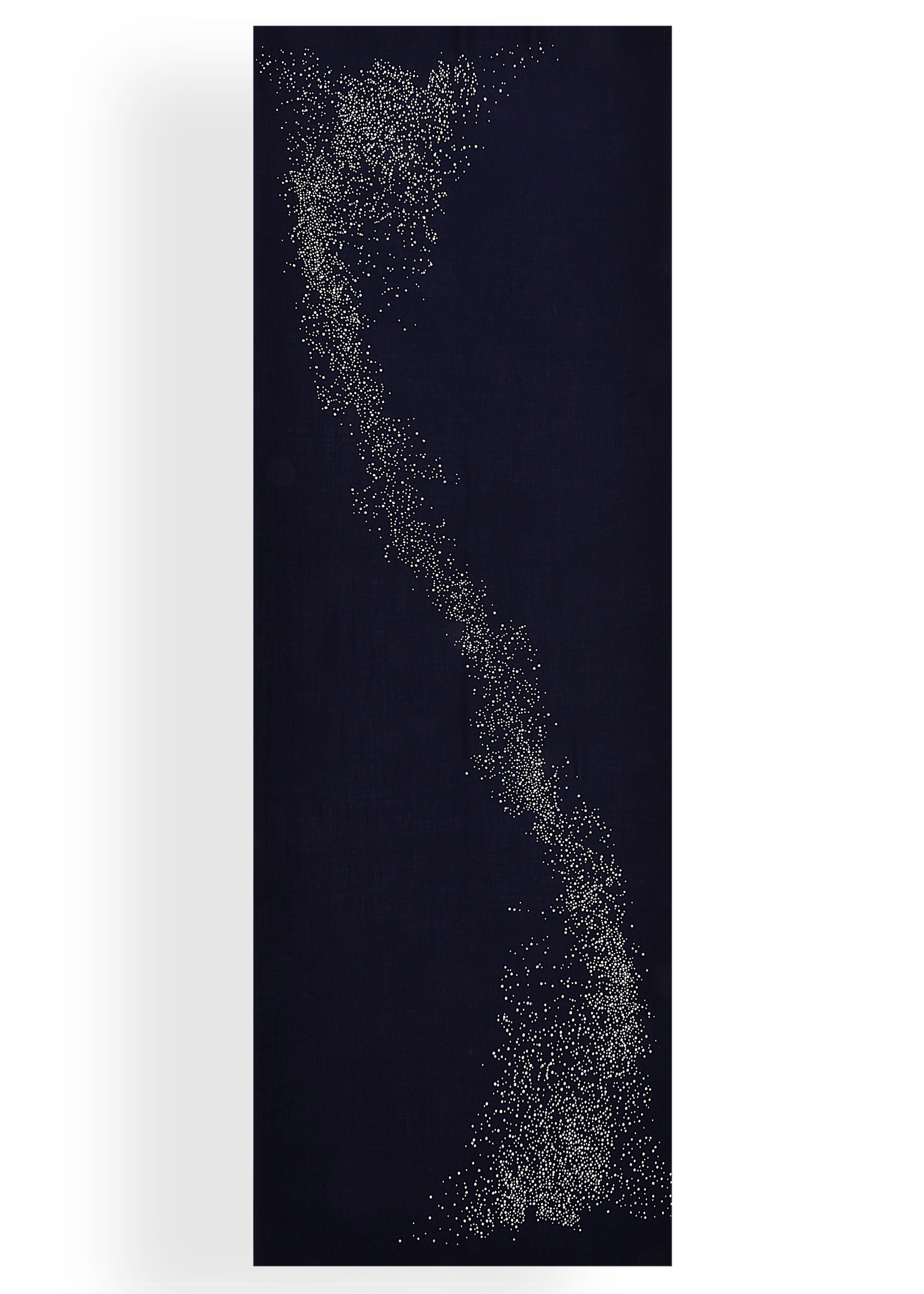 Hand Embroidered Galaxy in silver Japanese beads and ivory pearls crafted on a navy Merino wrap.