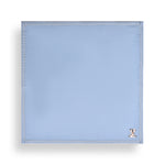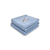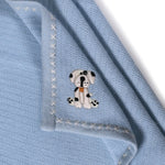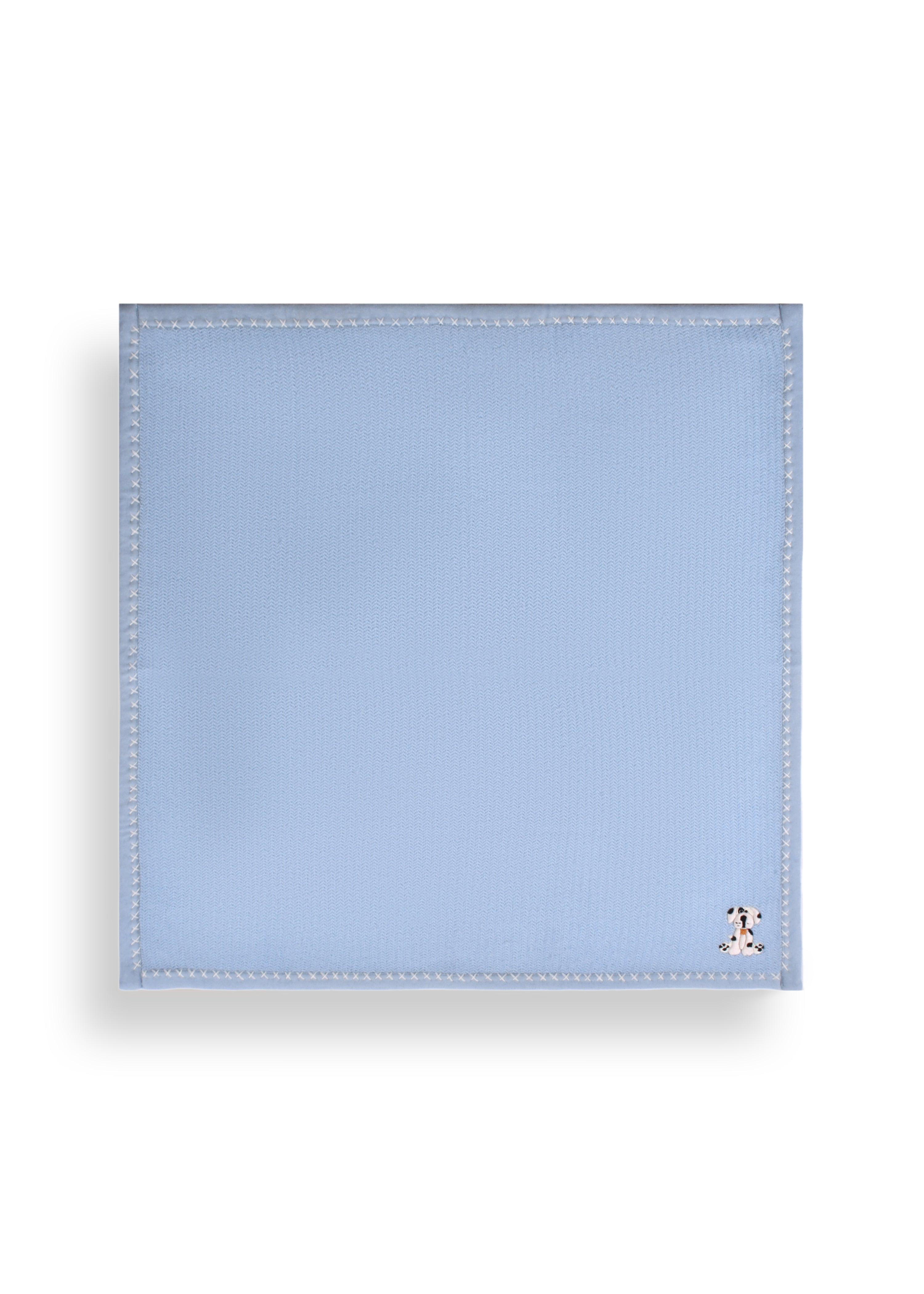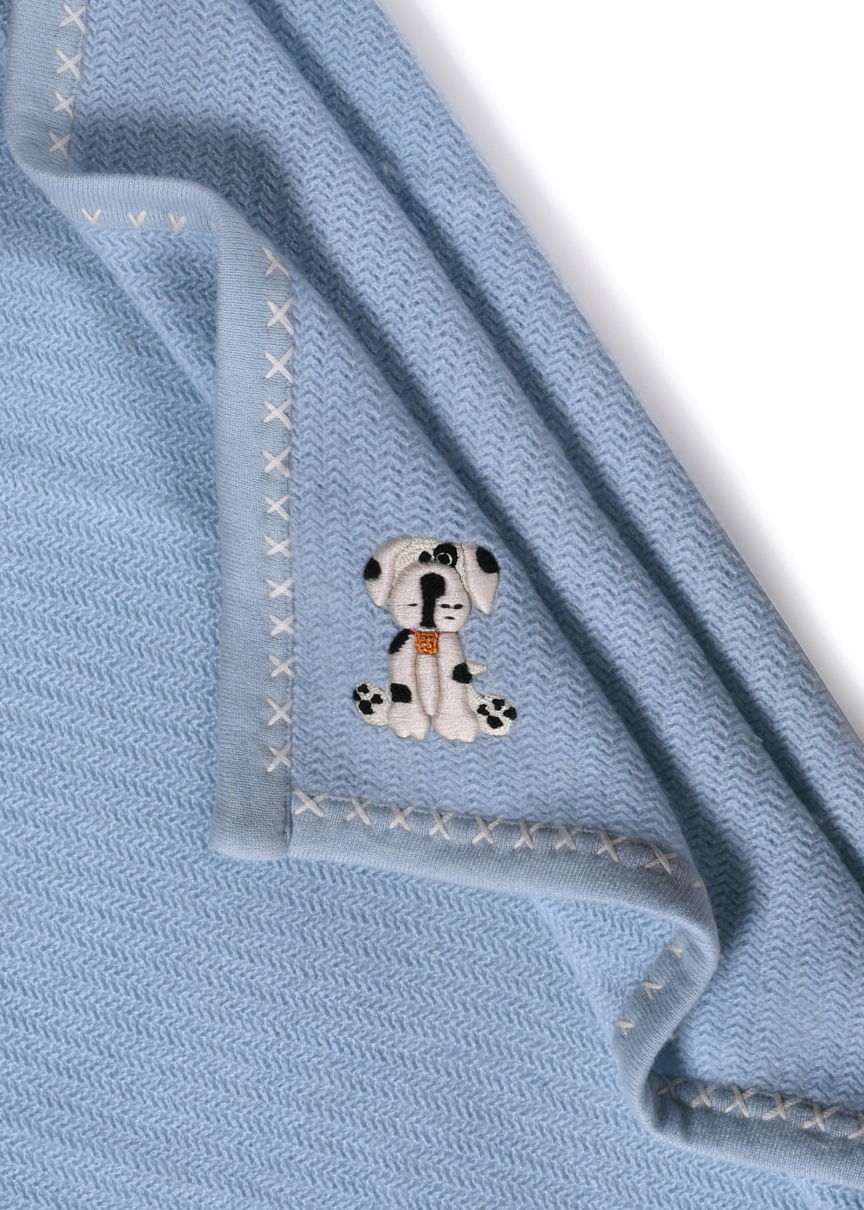 Soft and lightweight herringbone baby blanket woven in Cashmere – Merino blend, on a baby blue base with ivory cross stitch edging. An embroidered dog adds to the warmth of the throw.