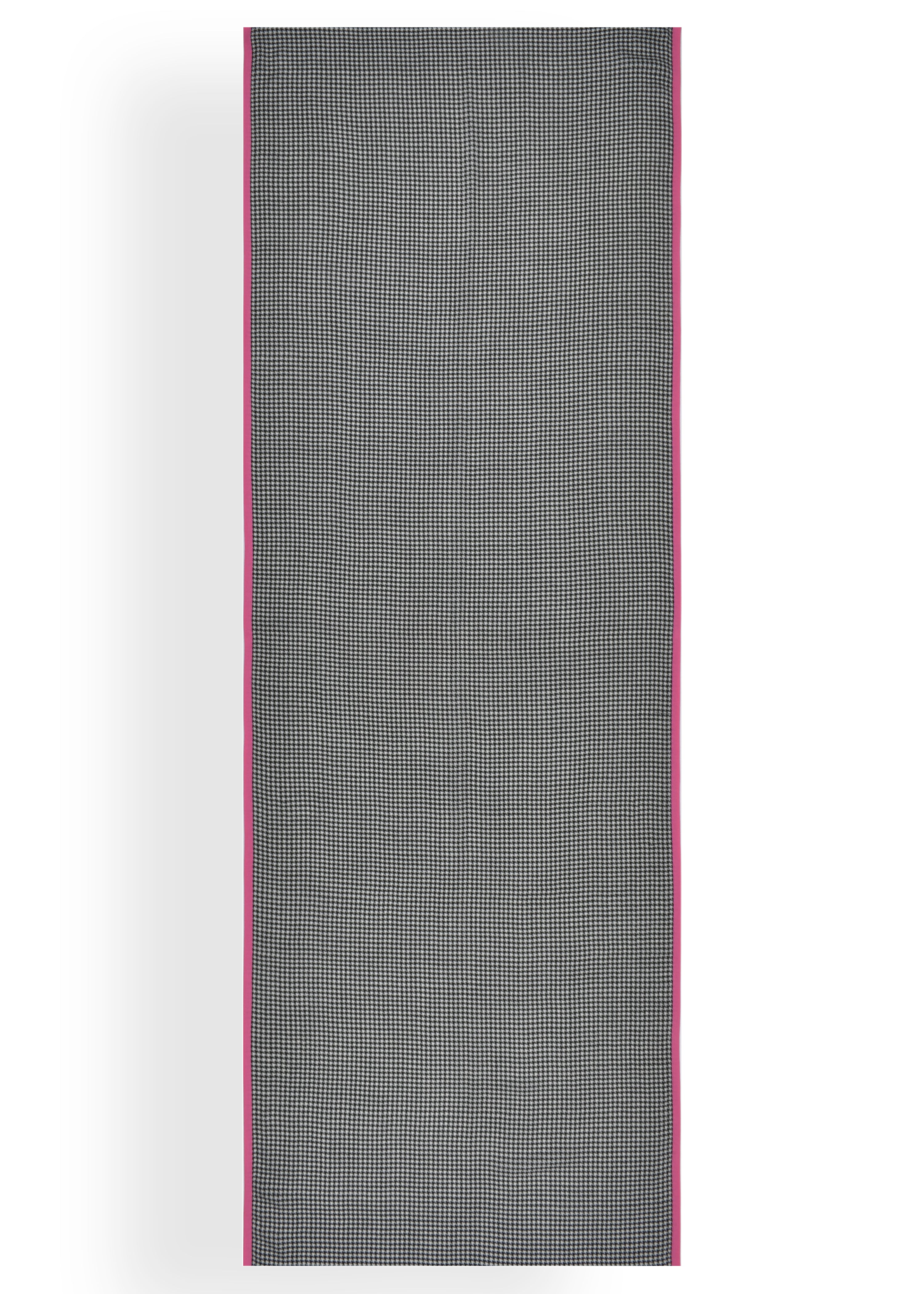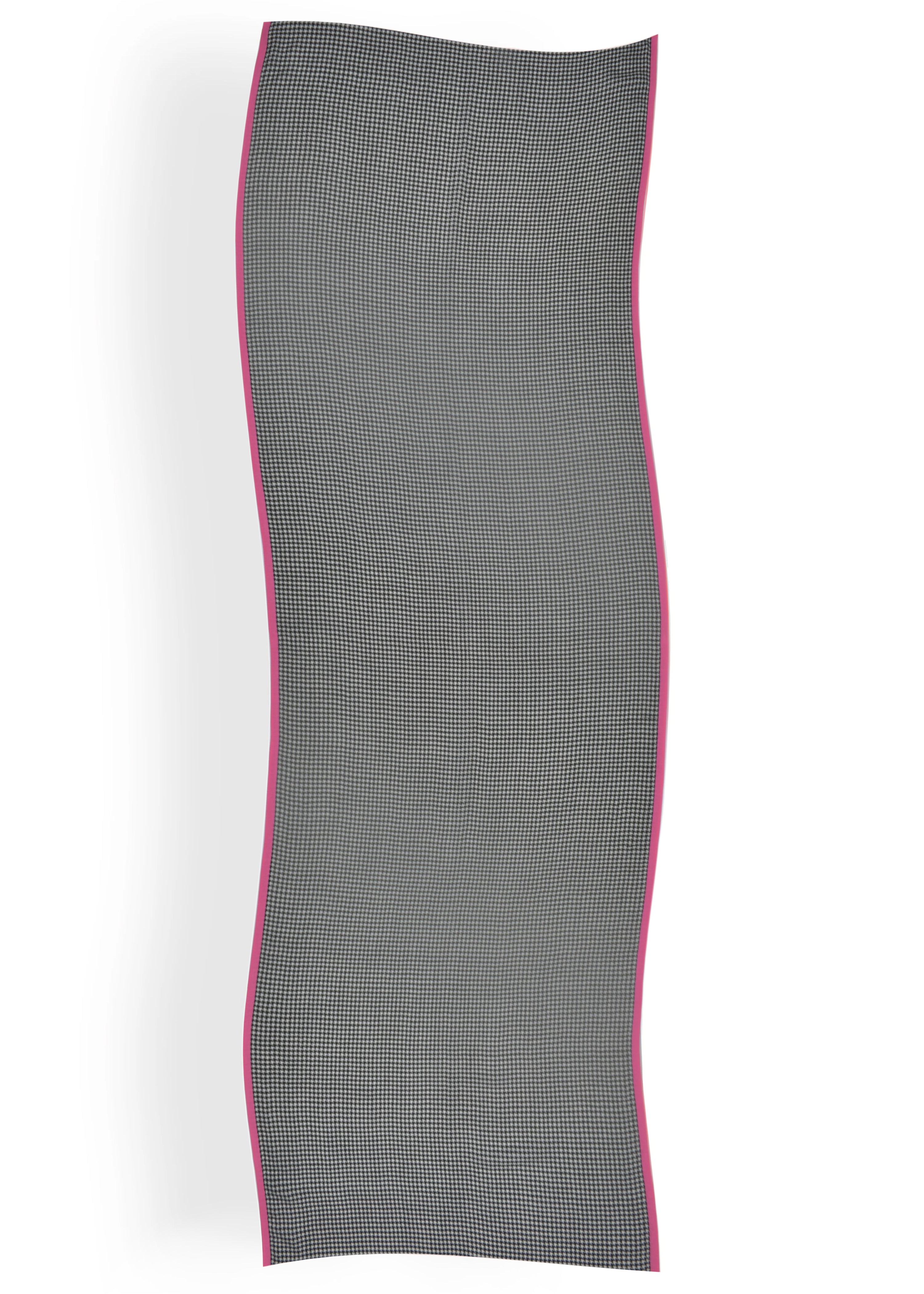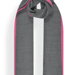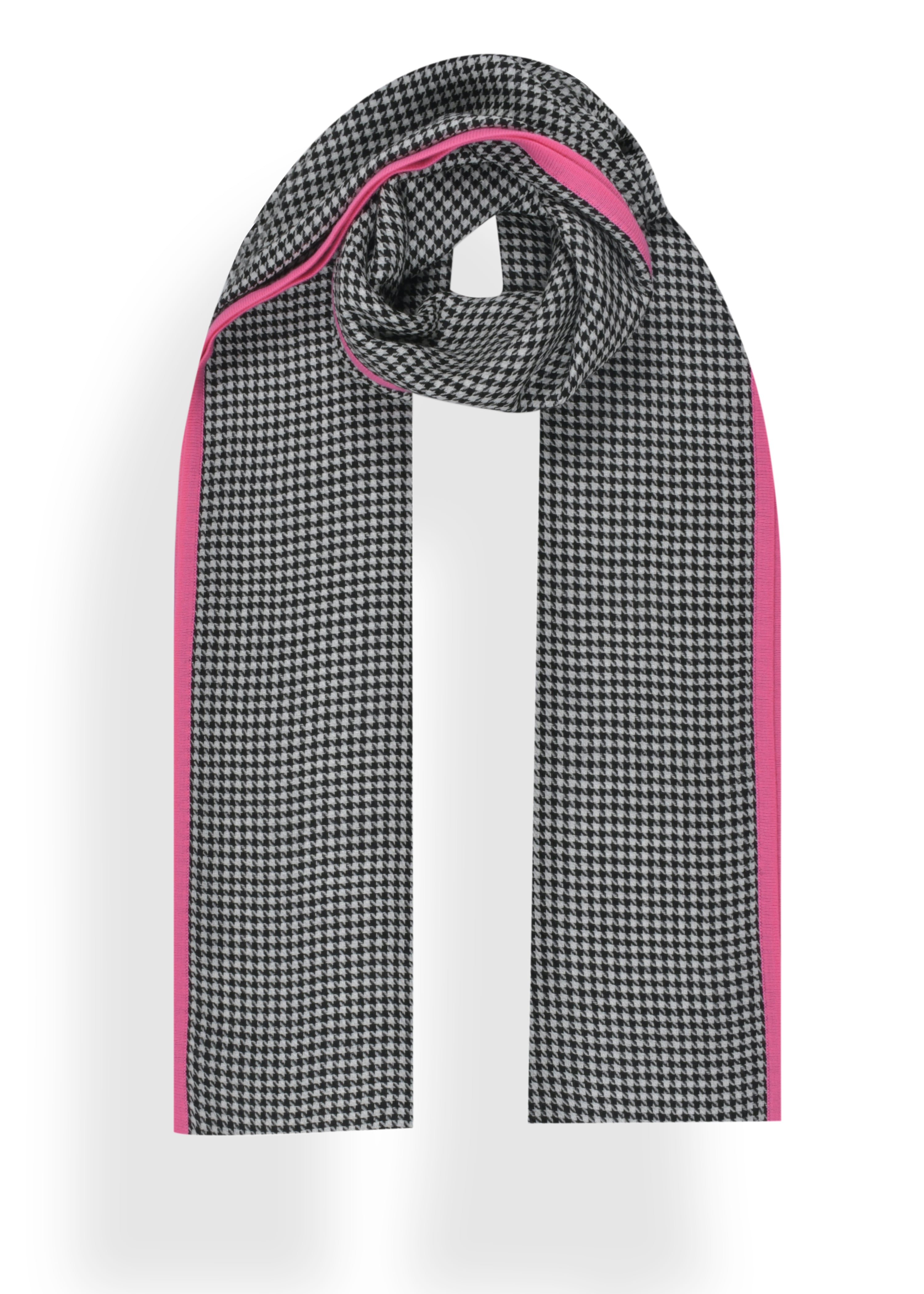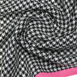 Featuring a bold black and ivory houndstooth weave in merino, accented with hot pink piping.