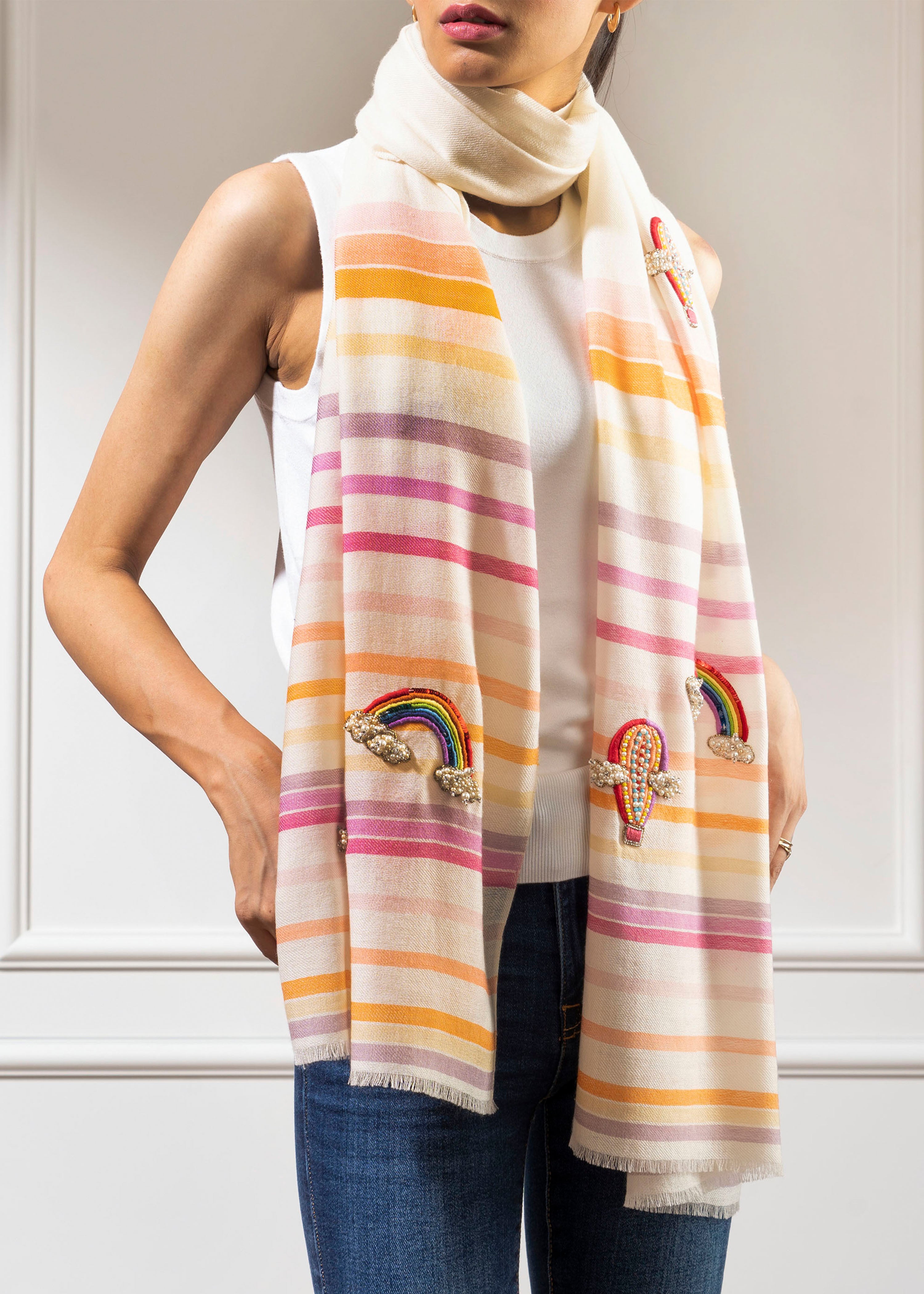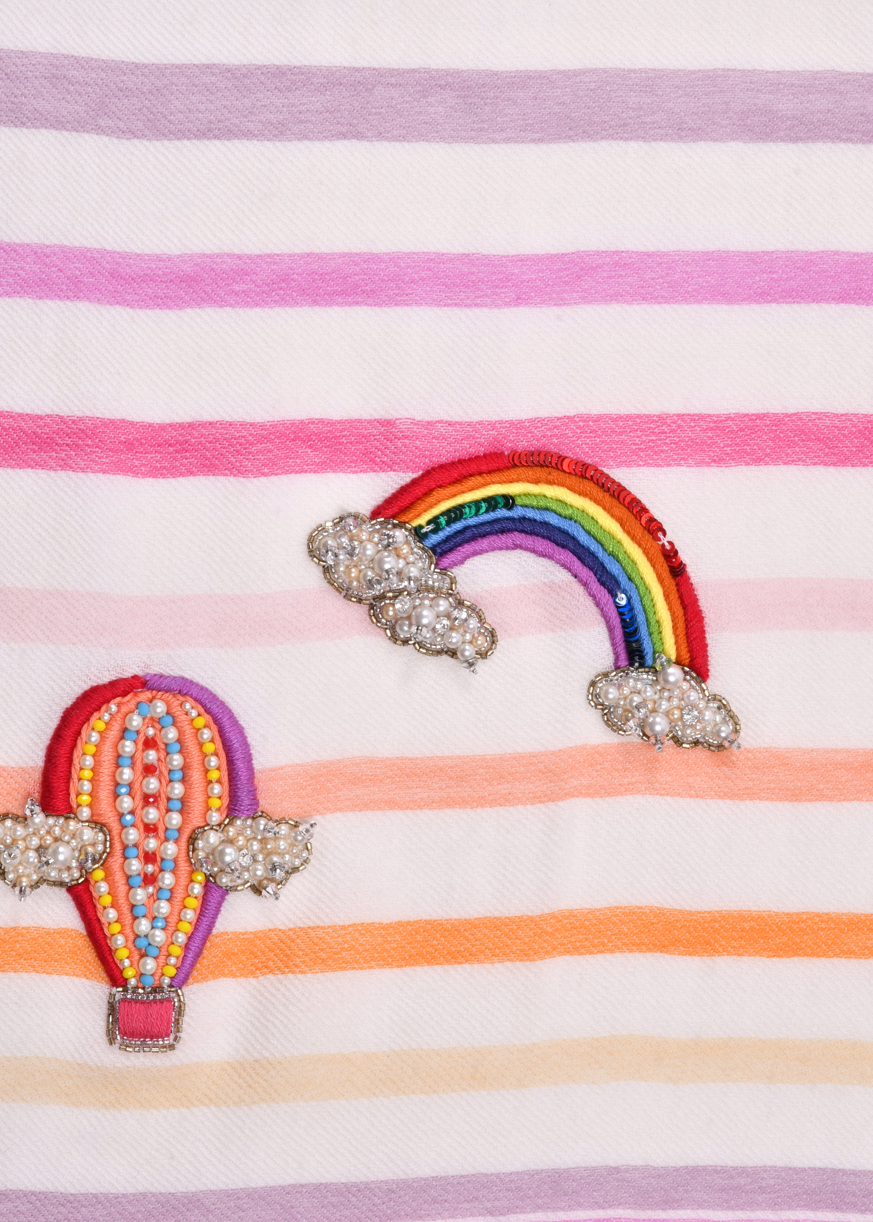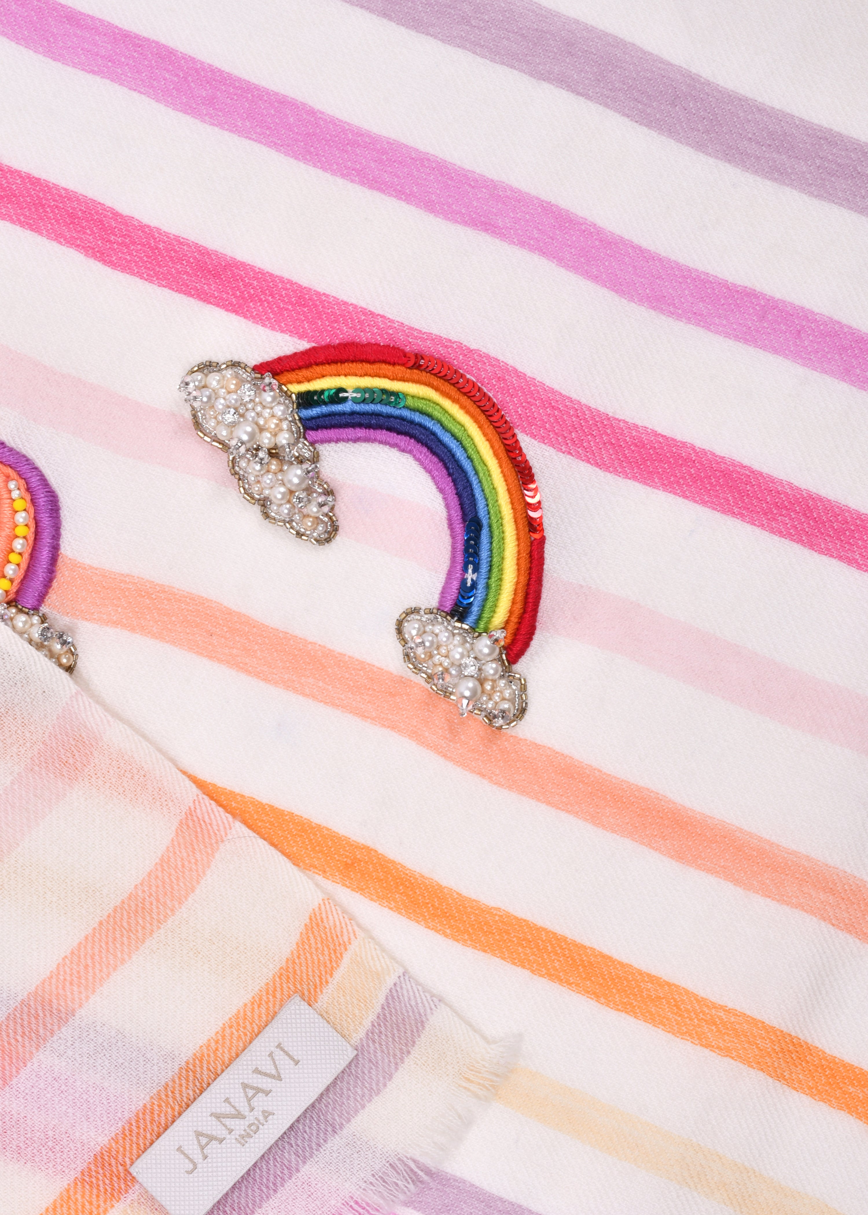 Rainbows and balloons  embroidered in pearls and sequins on an ivory Merino wool silk blend wrap, with multi colored stripes.
