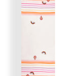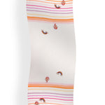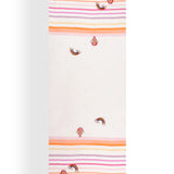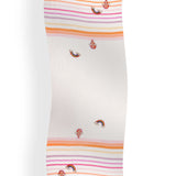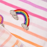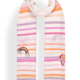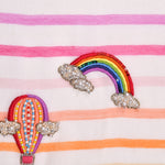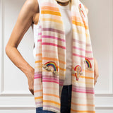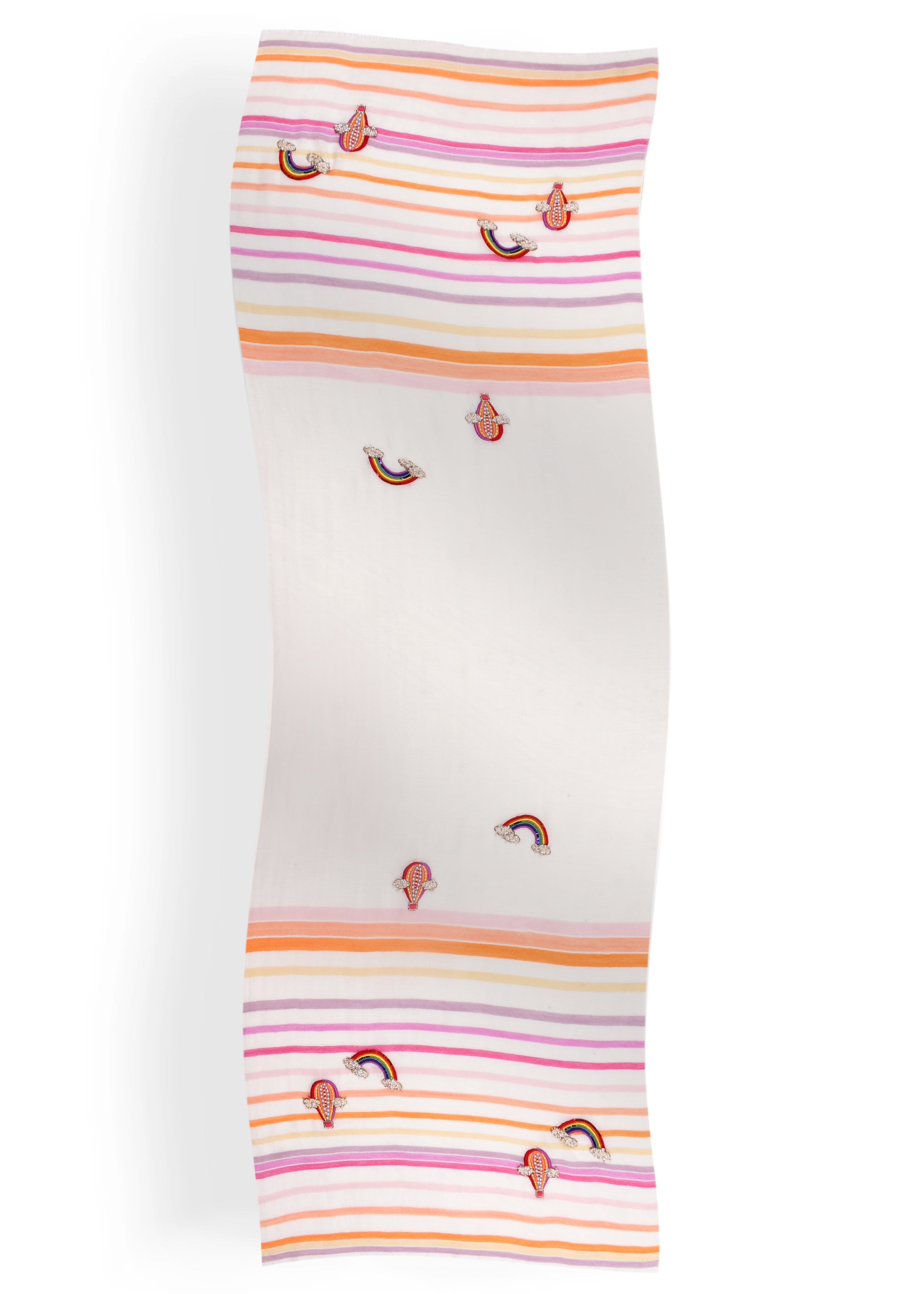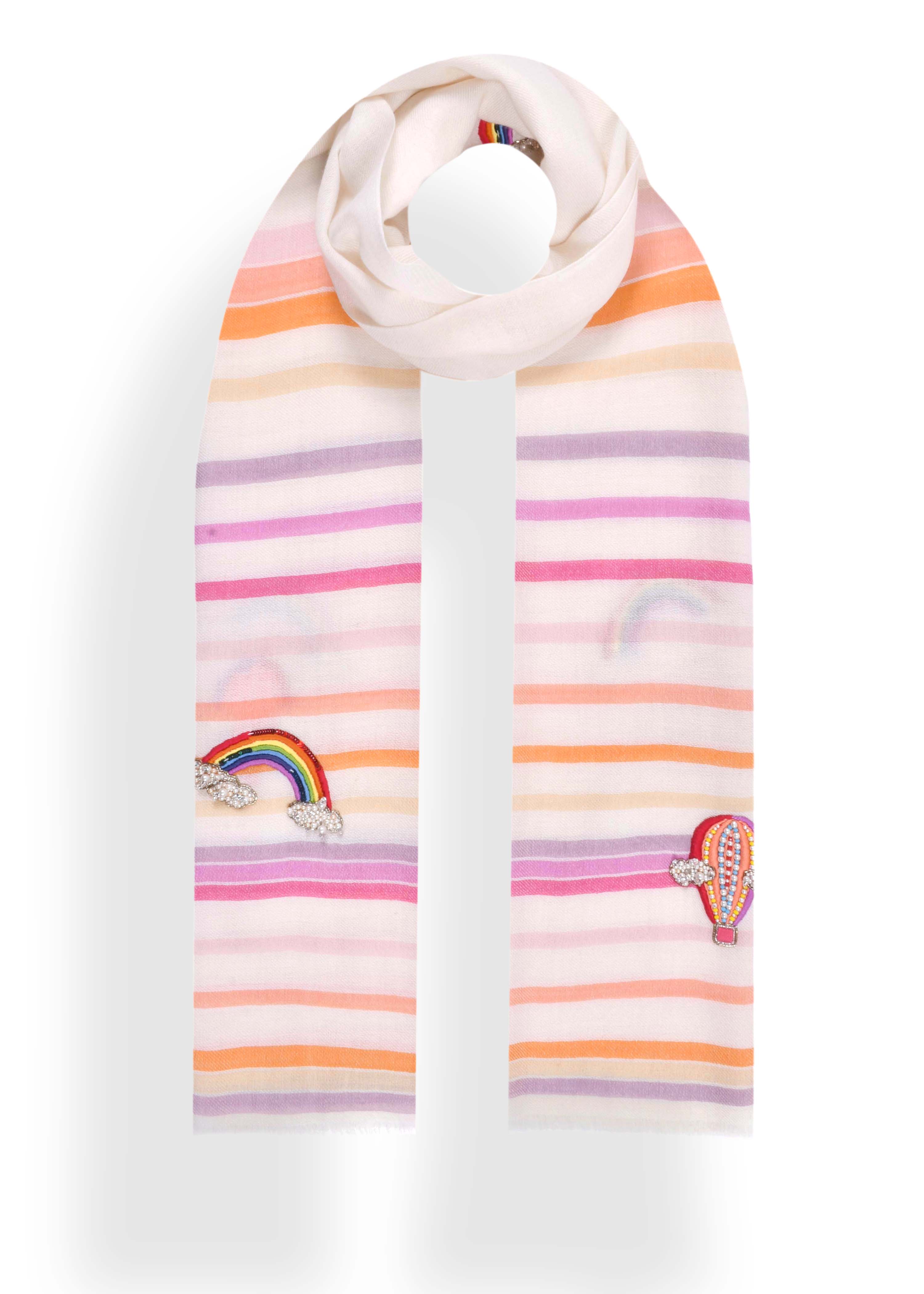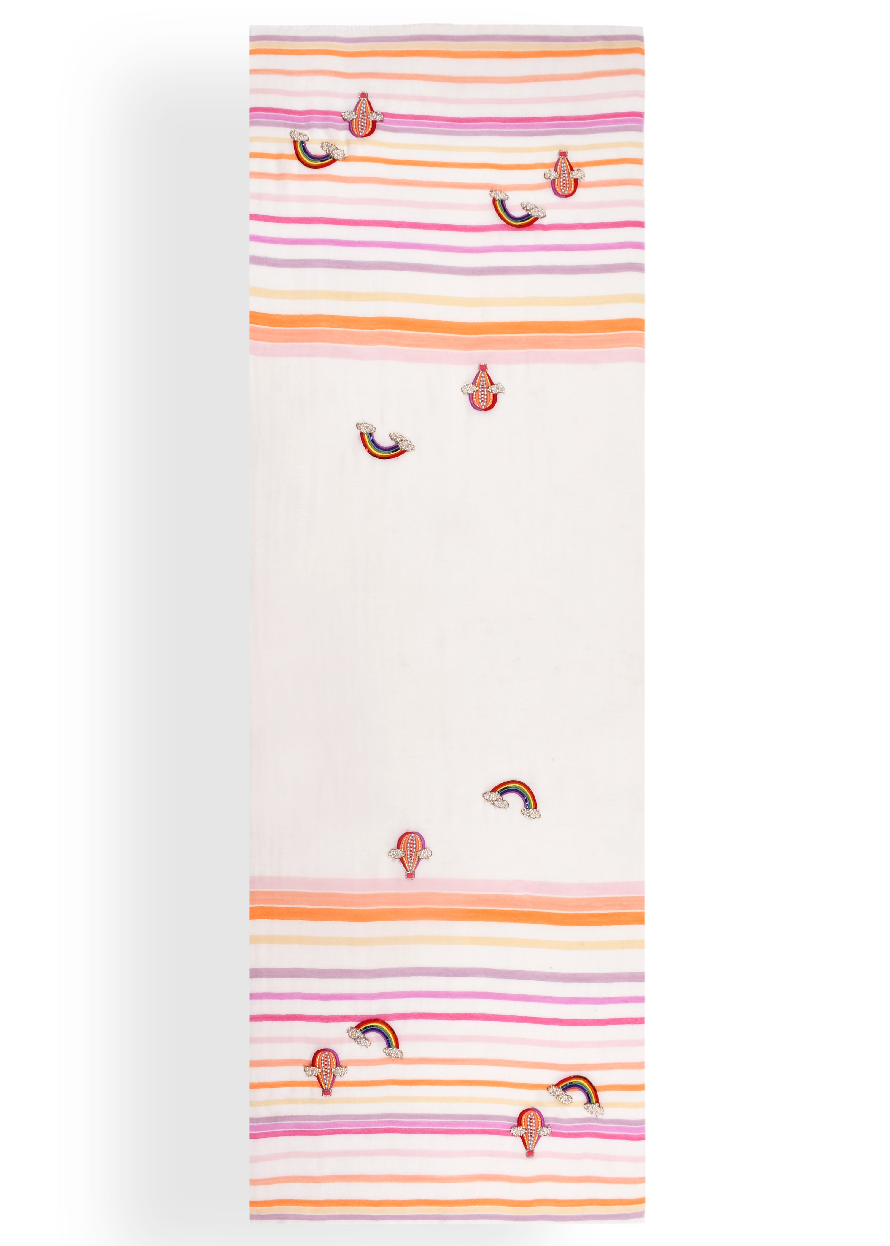 Rainbows and balloons  embroidered in pearls and sequins on an ivory Merino wool silk blend wrap, with multi colored stripes.