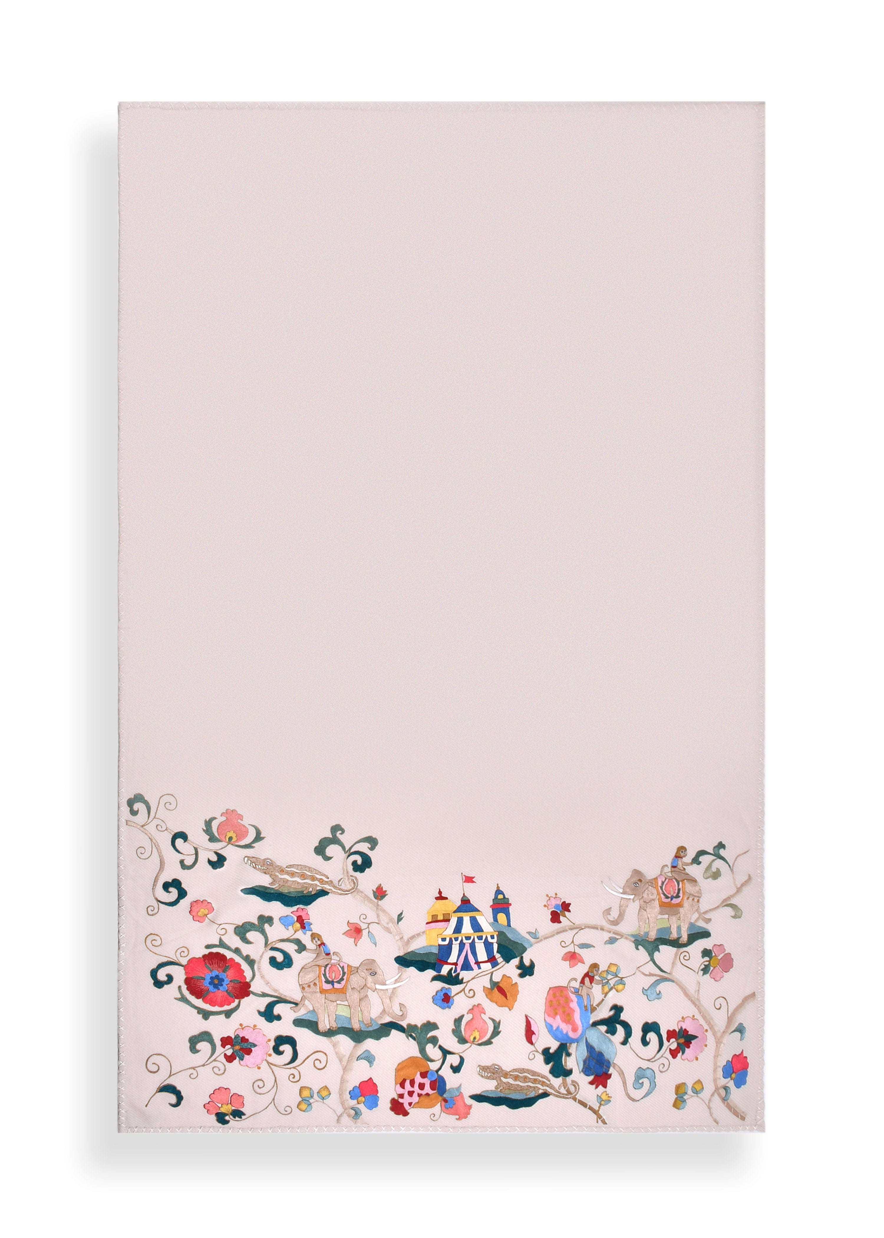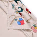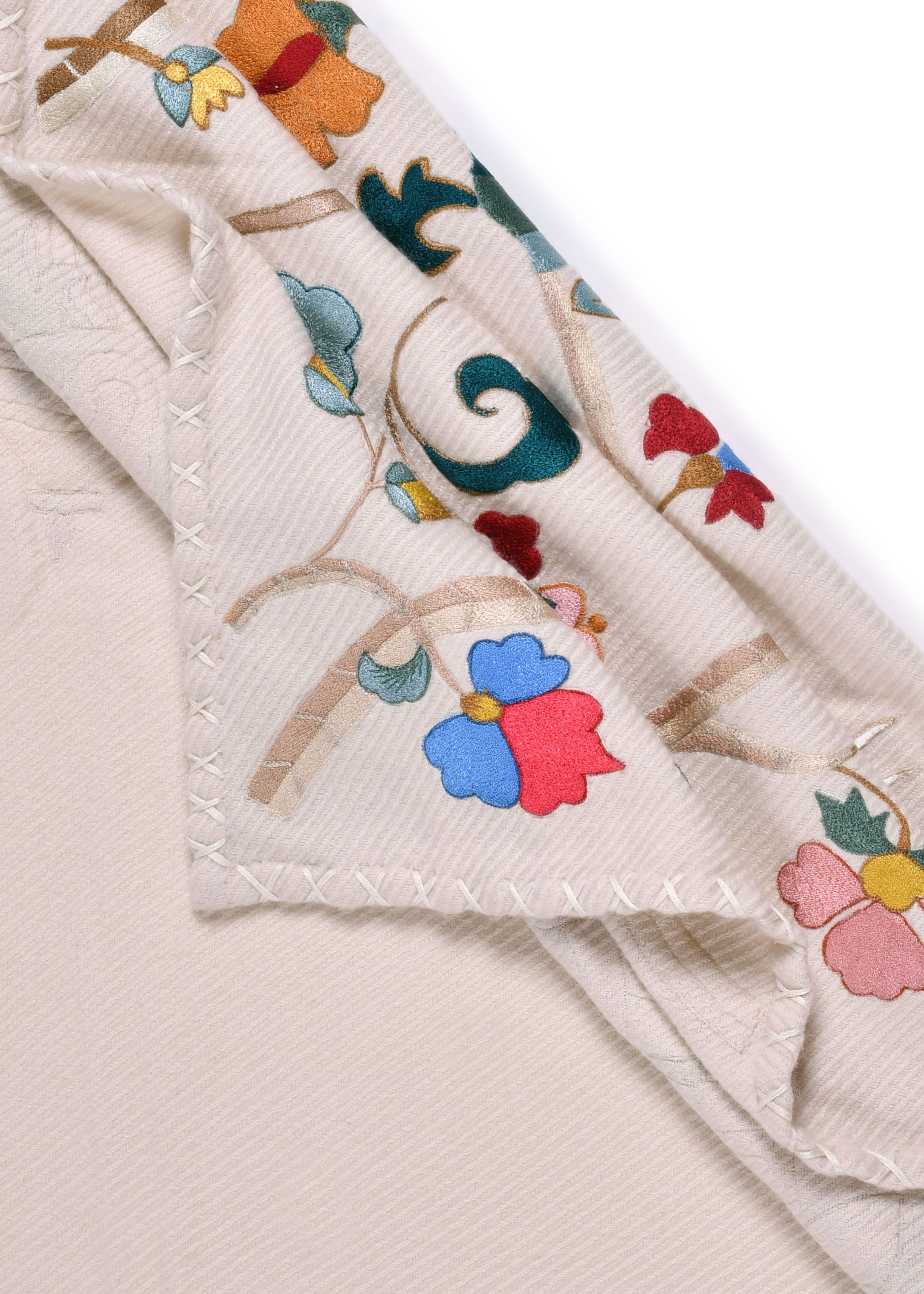 Embroidered twill weave blanket woven in pure cashmere, on a celestial white base, with tonal cross stitch edging.