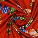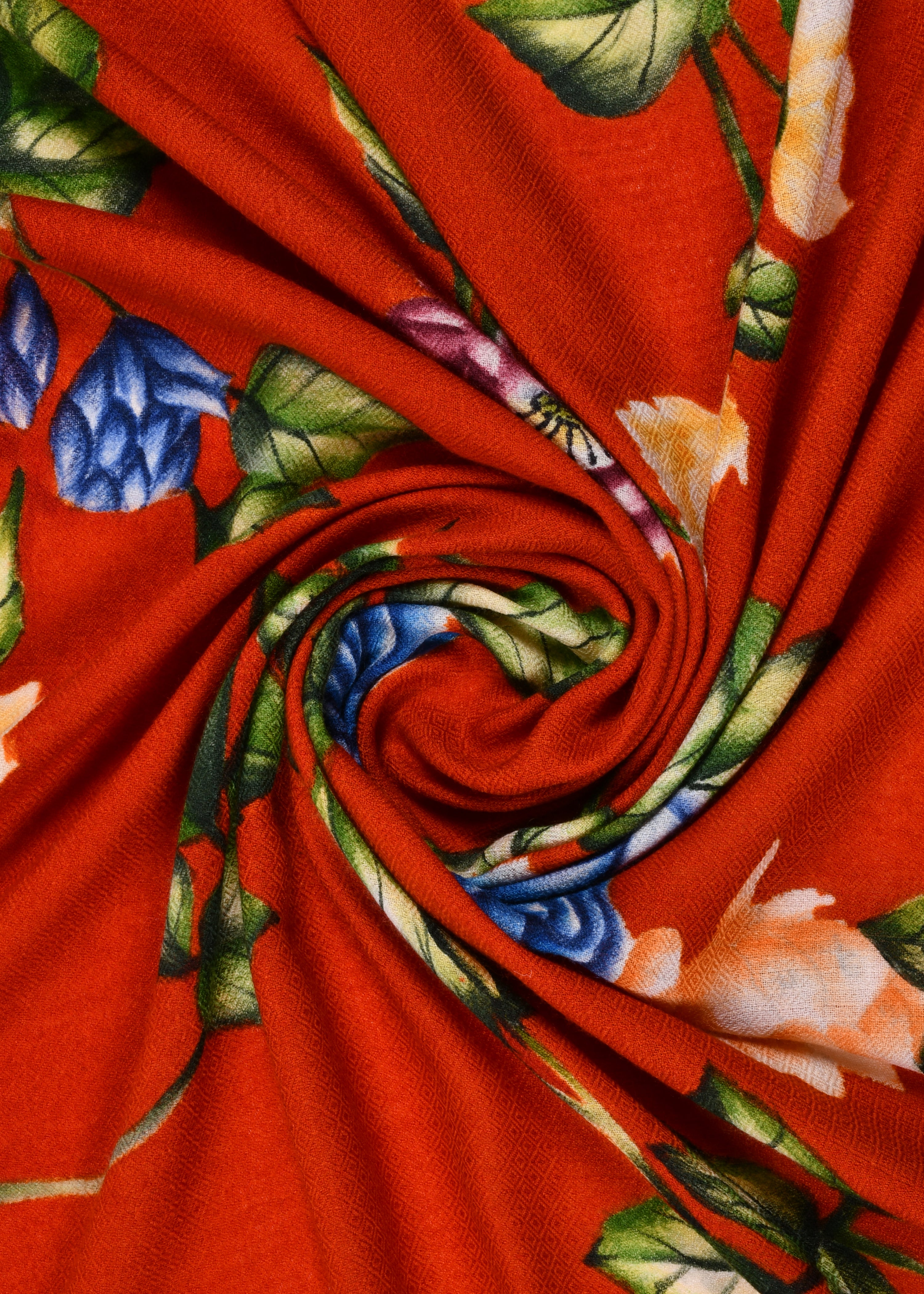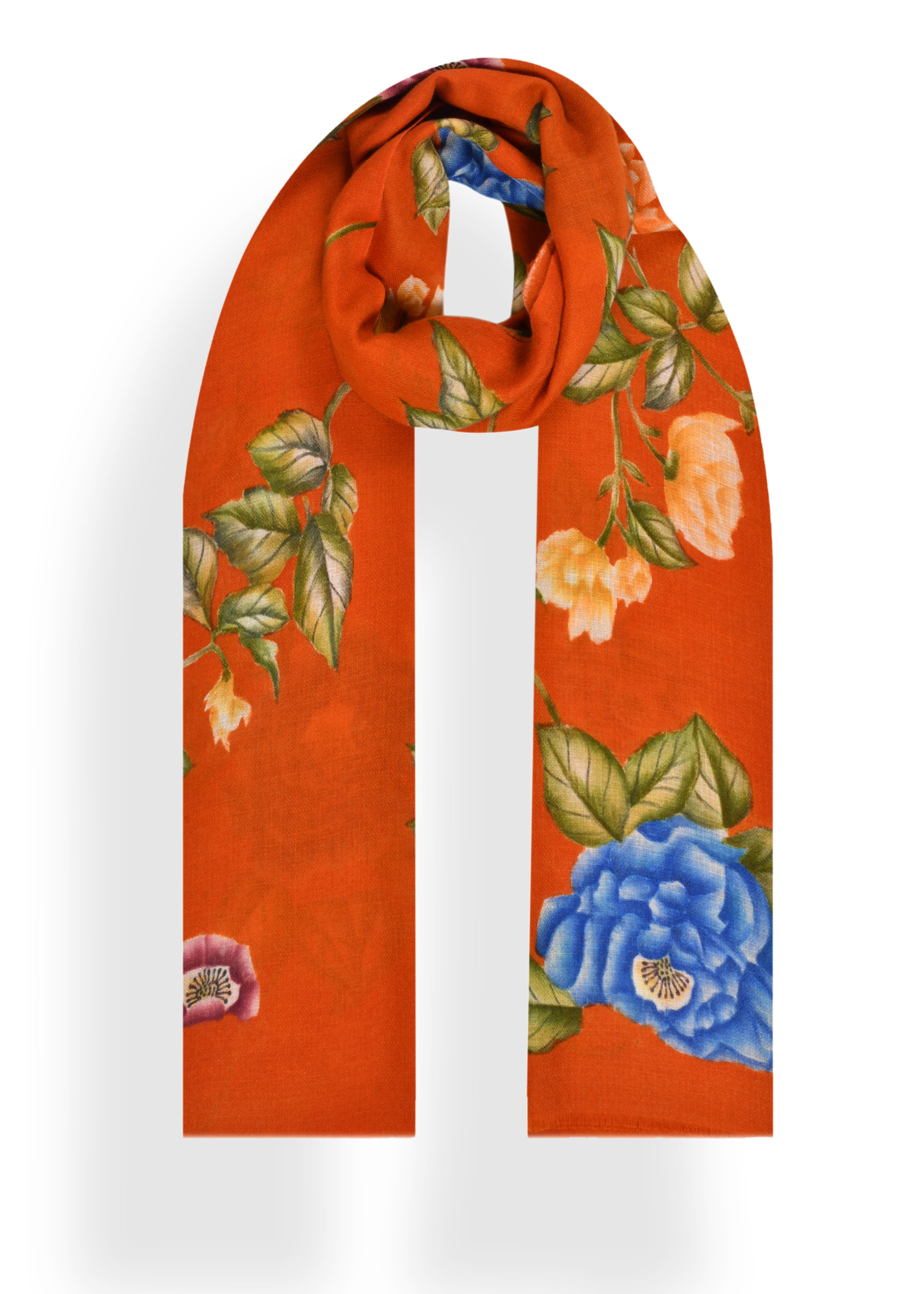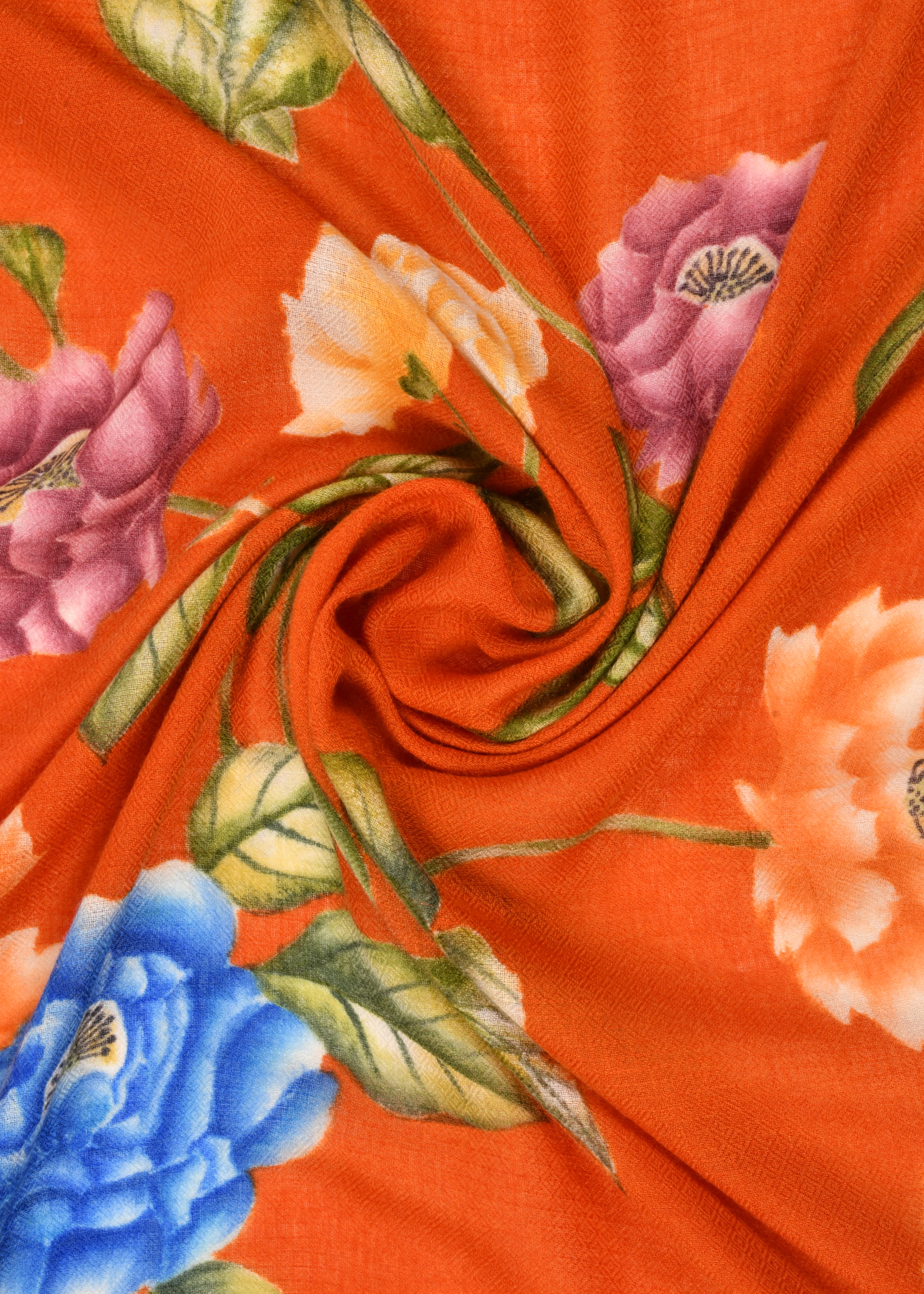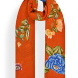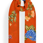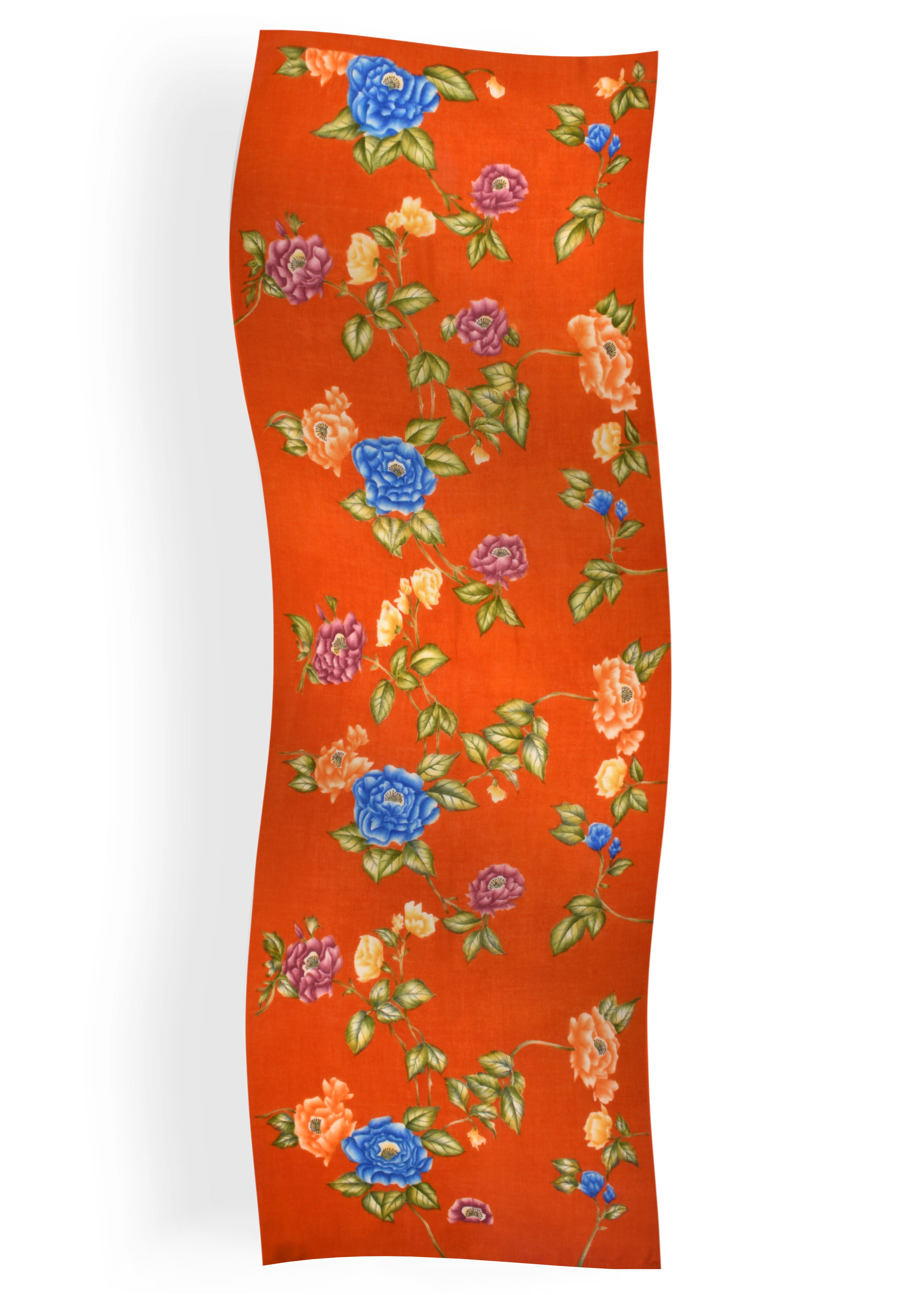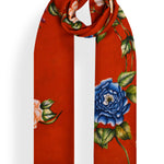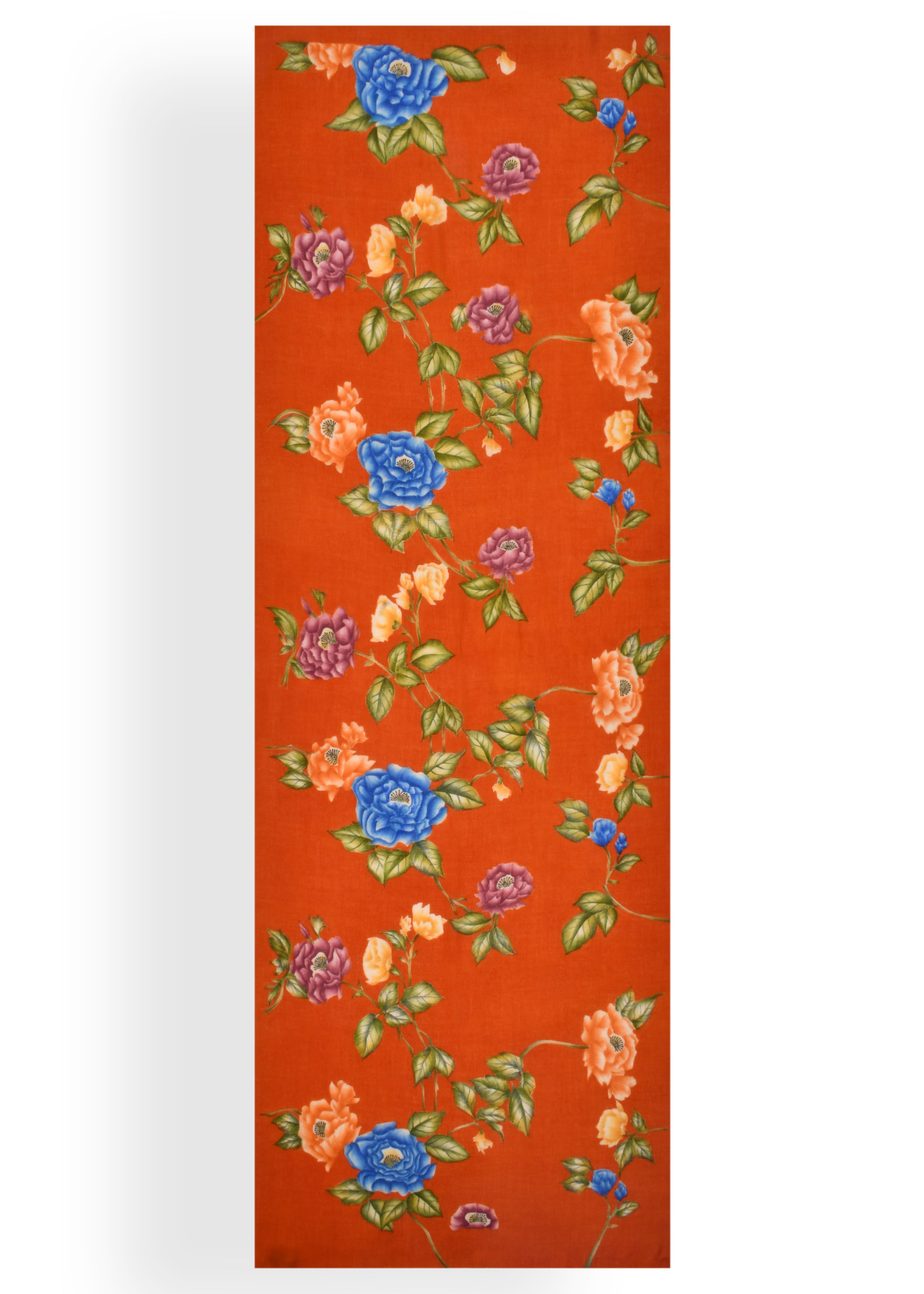 Hand painted florals and leaves in tones of blue on a Cashmere wrap.