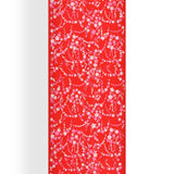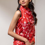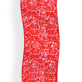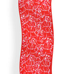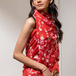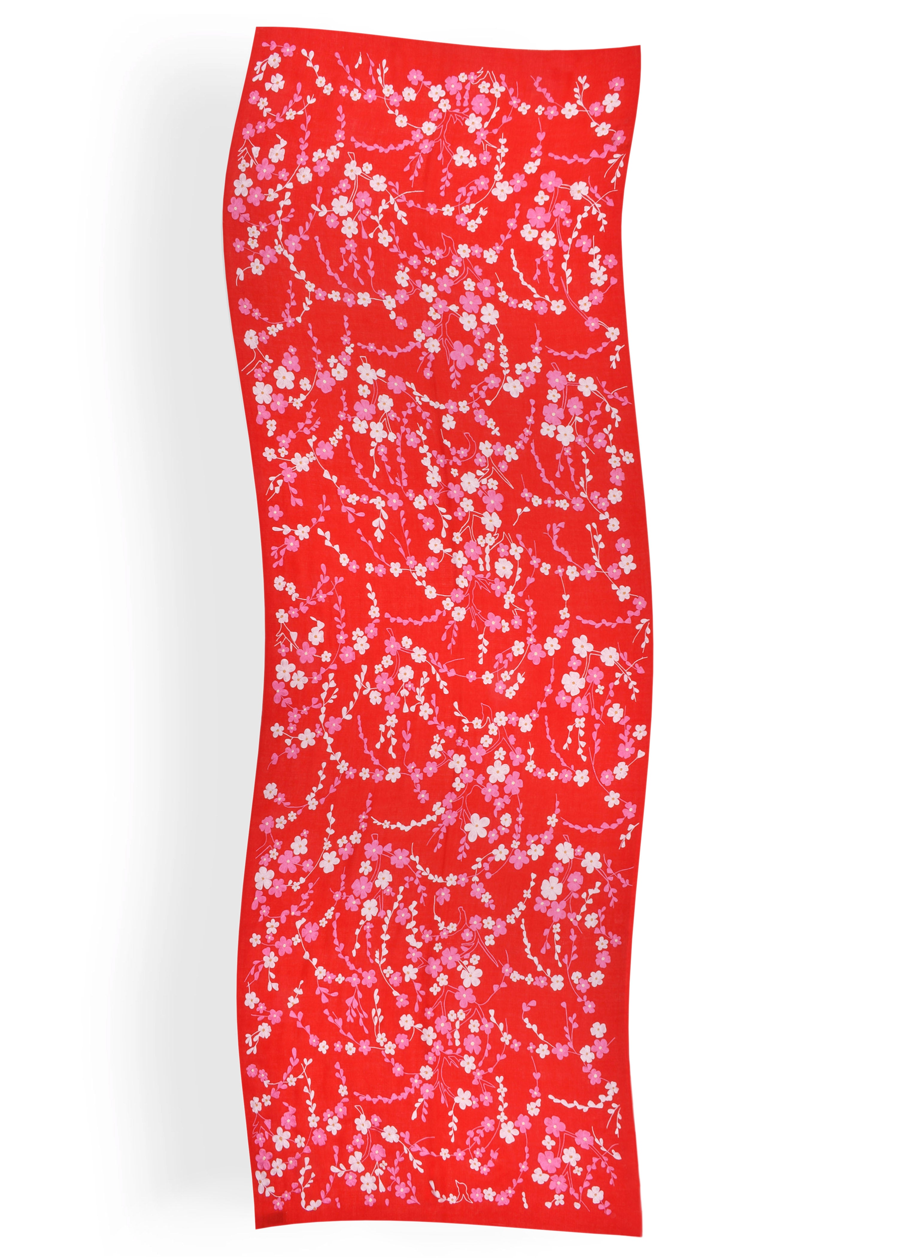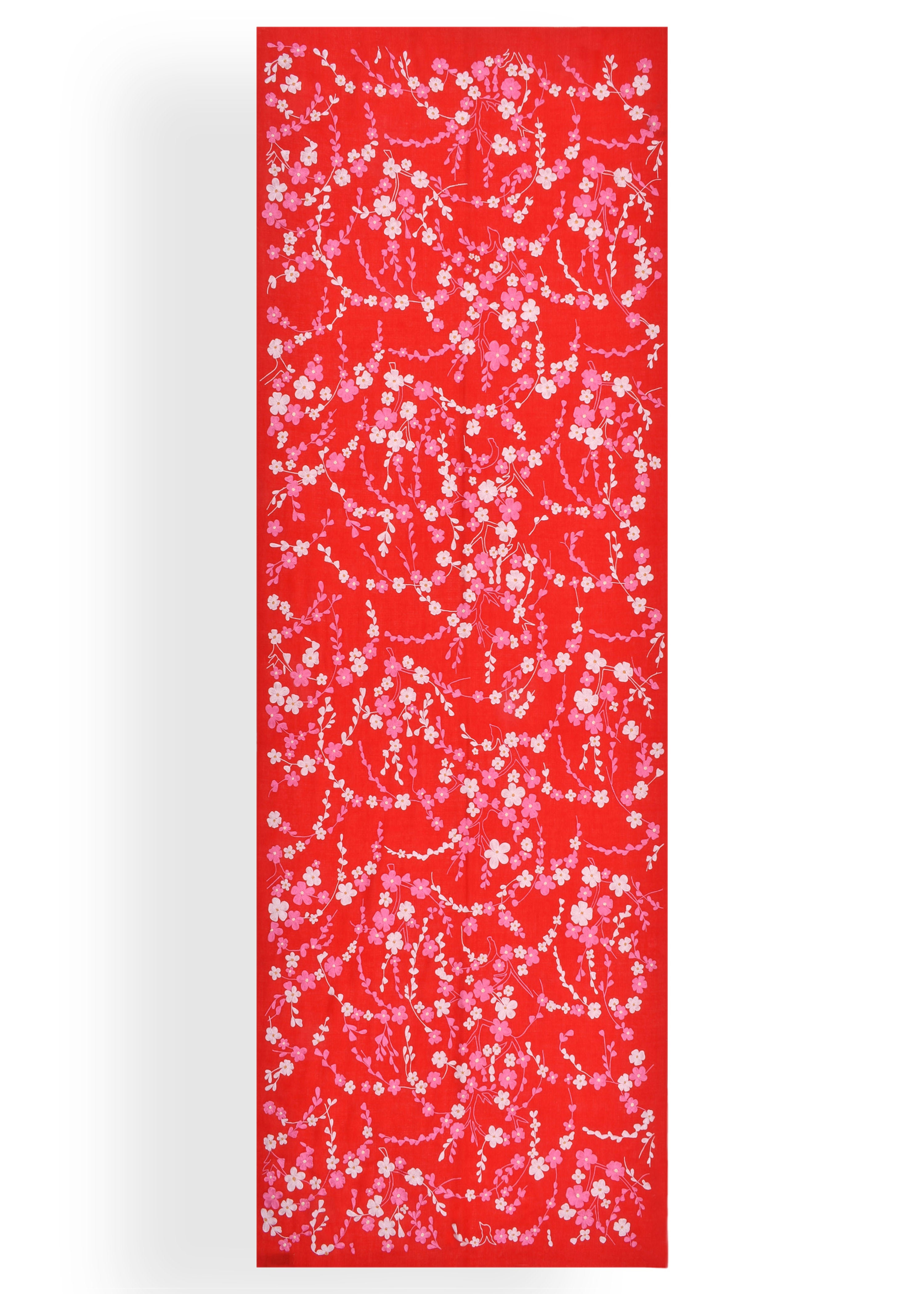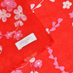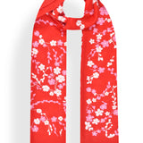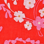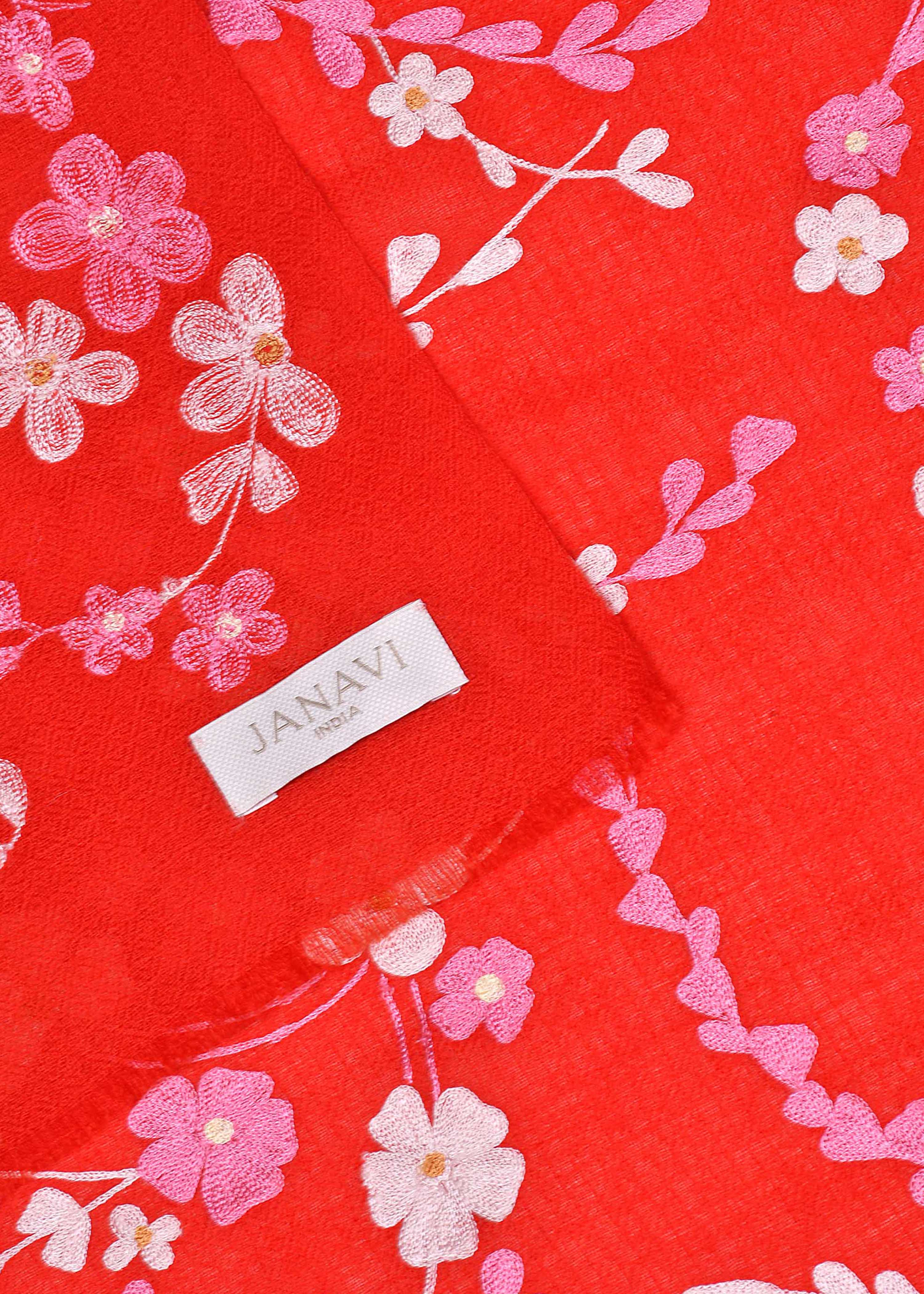 Pink and ivory cherry blossoms hand embroidered with silk thread on a red pure Cashmere wrap.