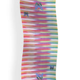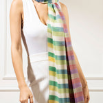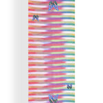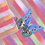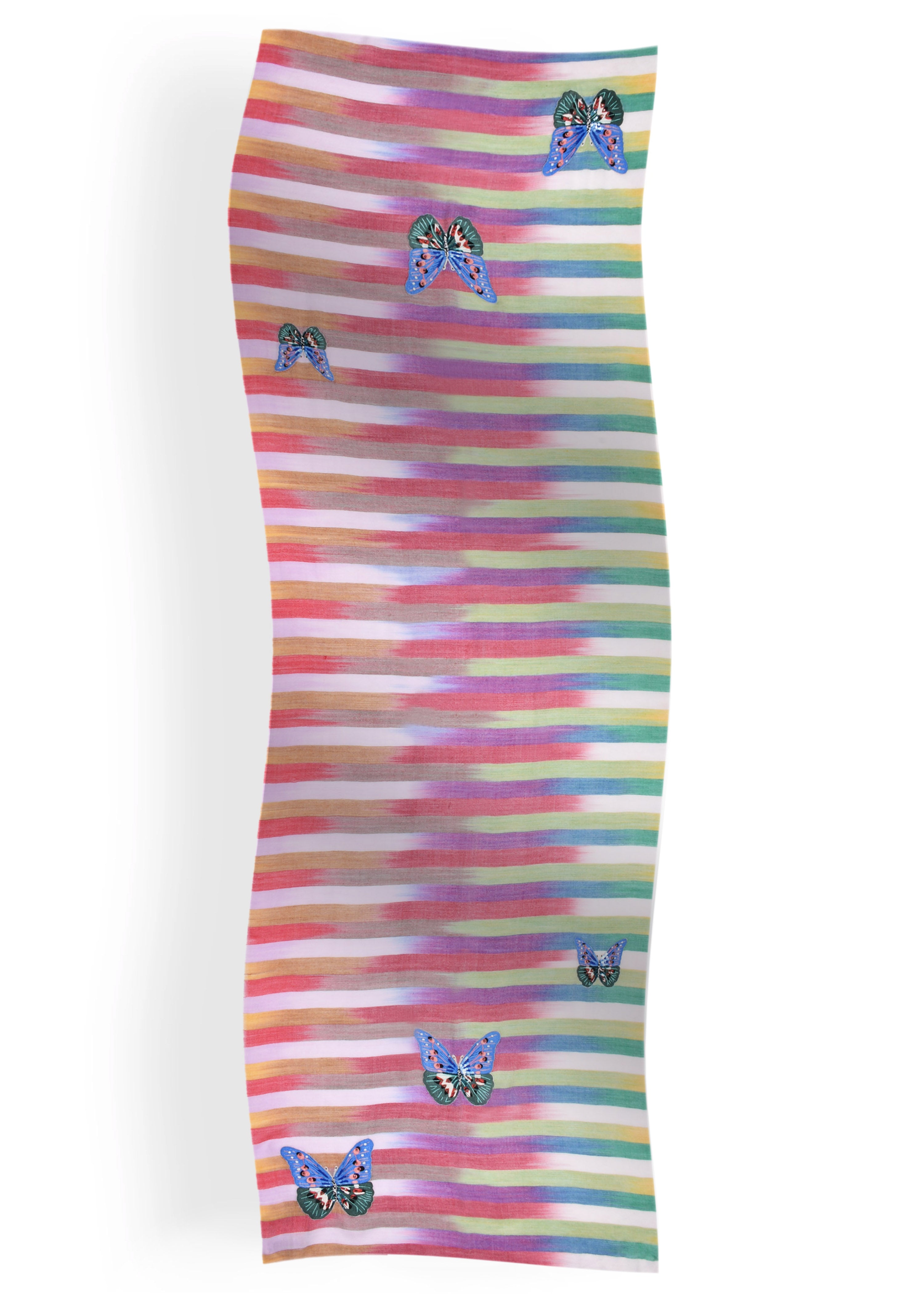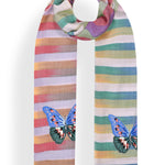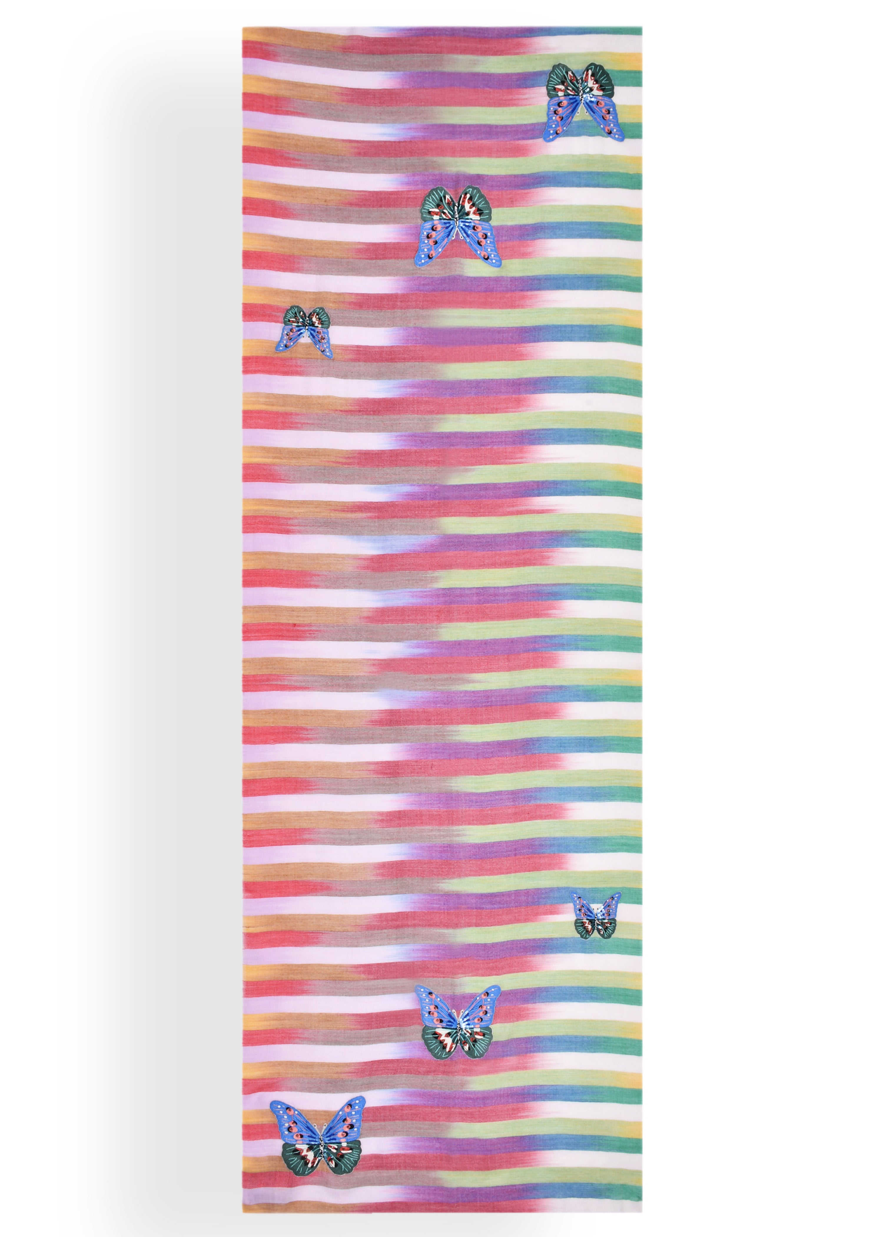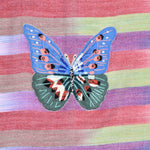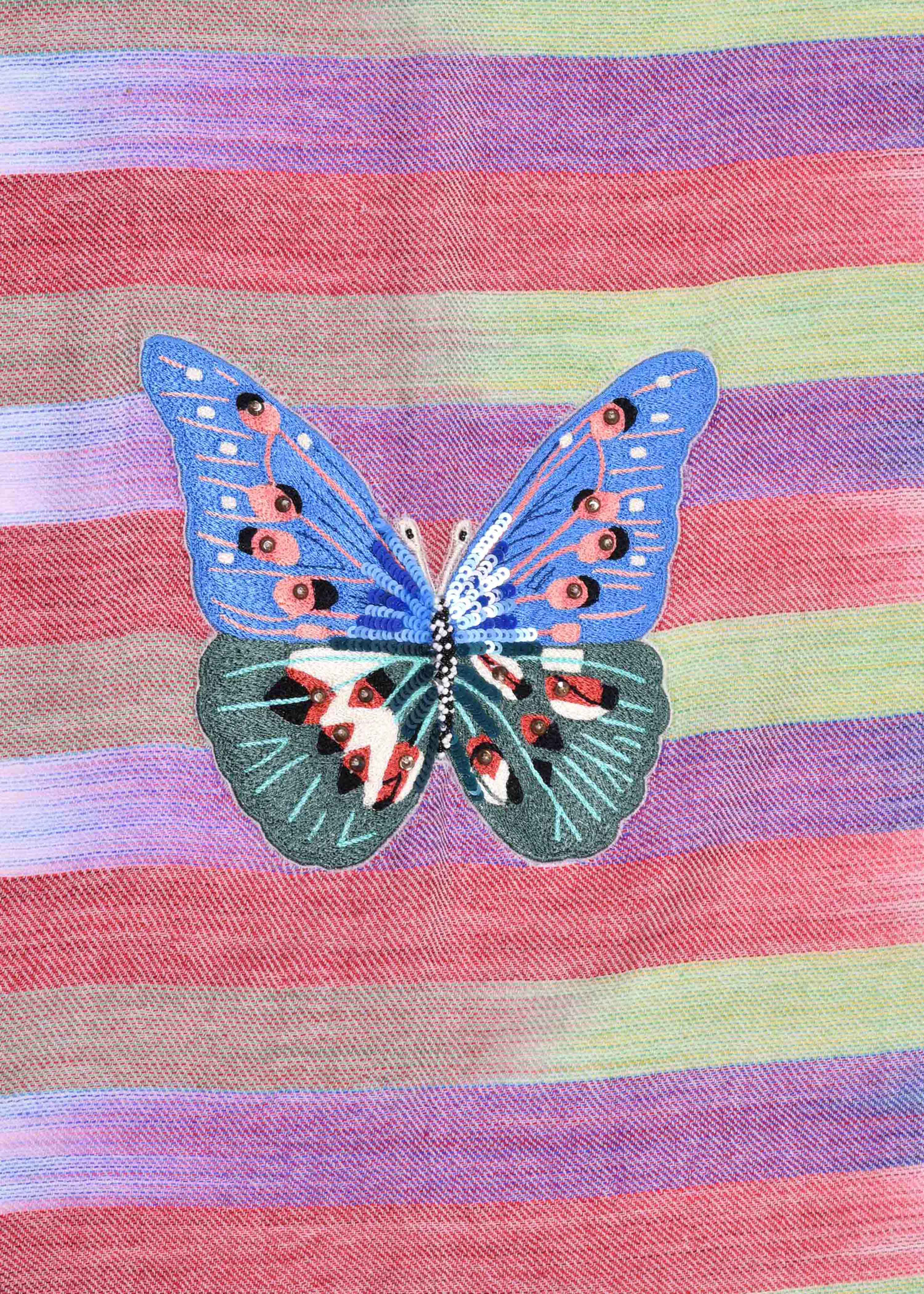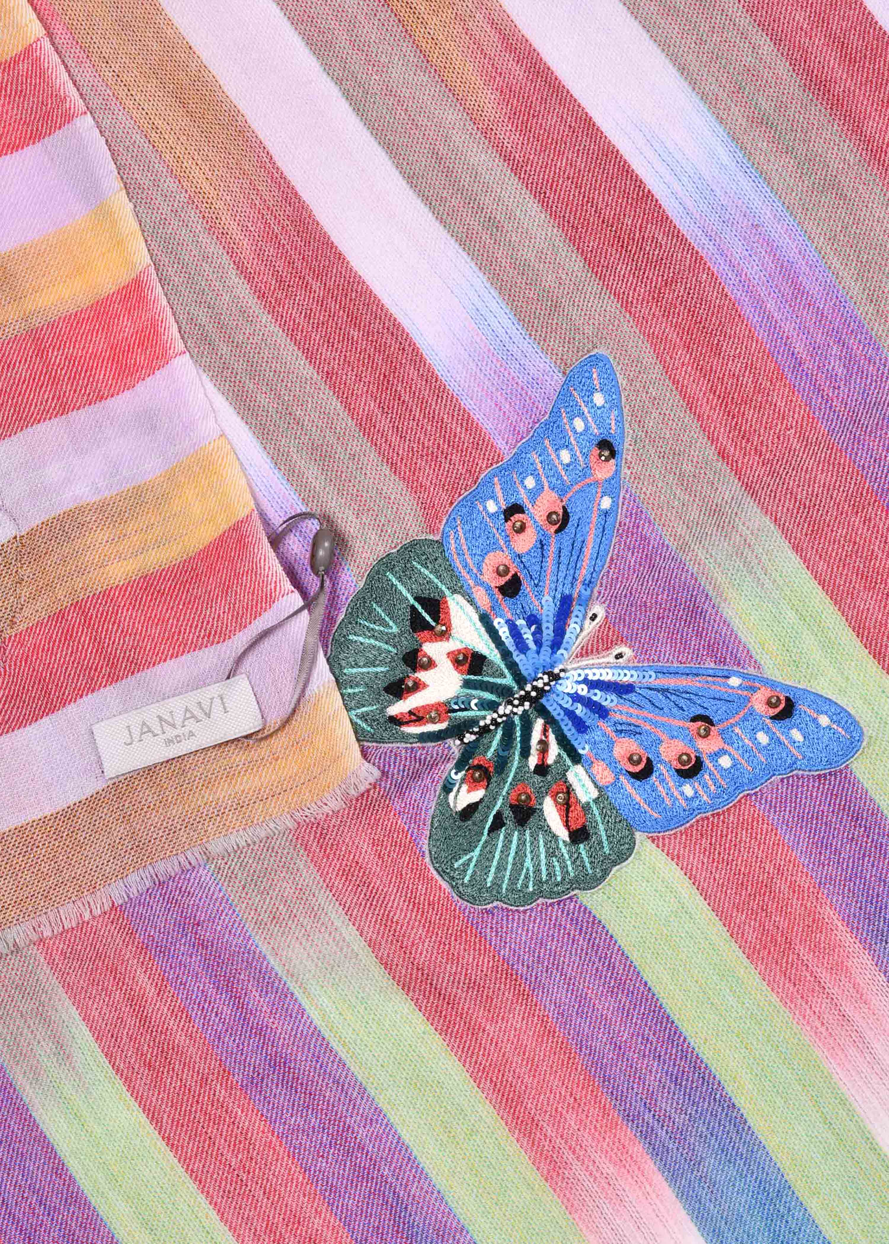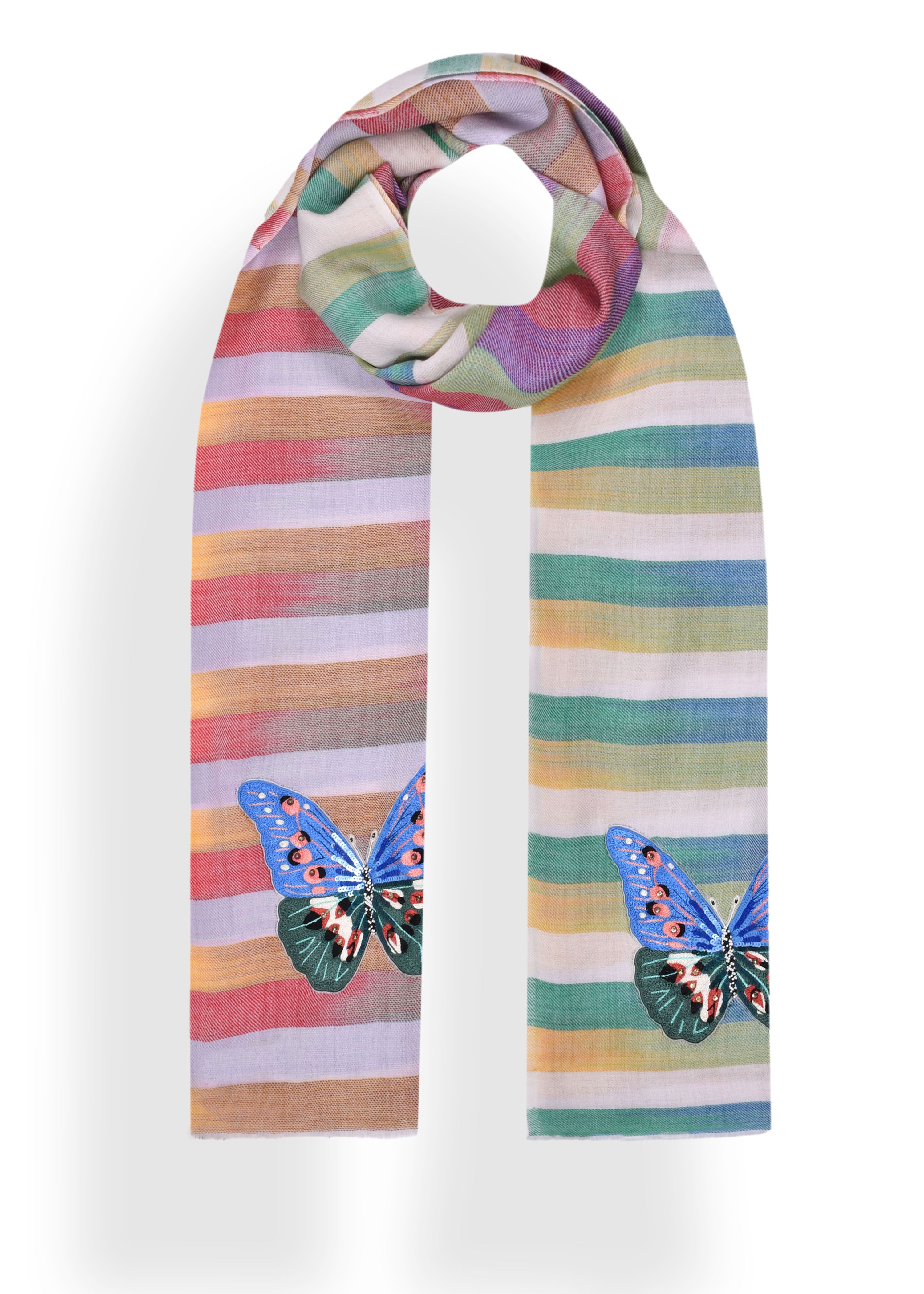 Embroidered butterflies embellished in beads and sequins, crafted on a hand woven striped multi colored Merino jacquard wrap.